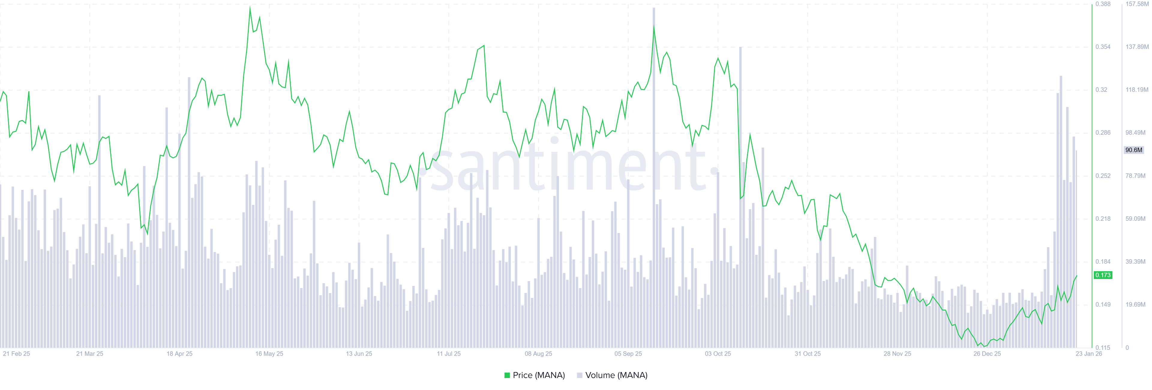 However, if MANA faces a correction, it could extend the decline toward the 50-day EMA at $0.152.