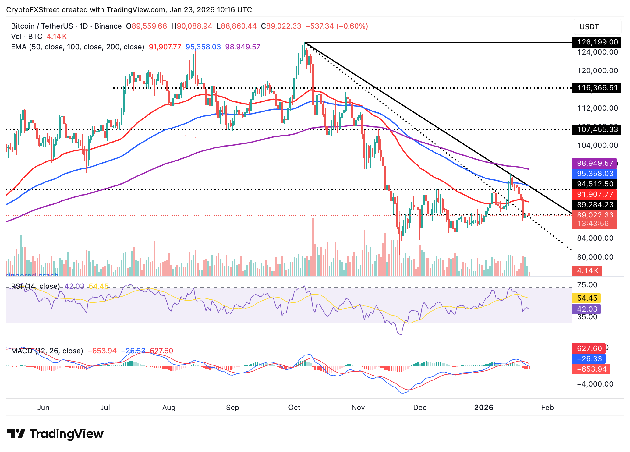 Bitcoin has extended its down leg toward the $89,000 threshold, as indicators continue to flash bearish signals. The Relative Strength Index (RSI) at 42 on the daily chart, is pointing downward, suggesting that BTC’s technical structure could continue to weaken.