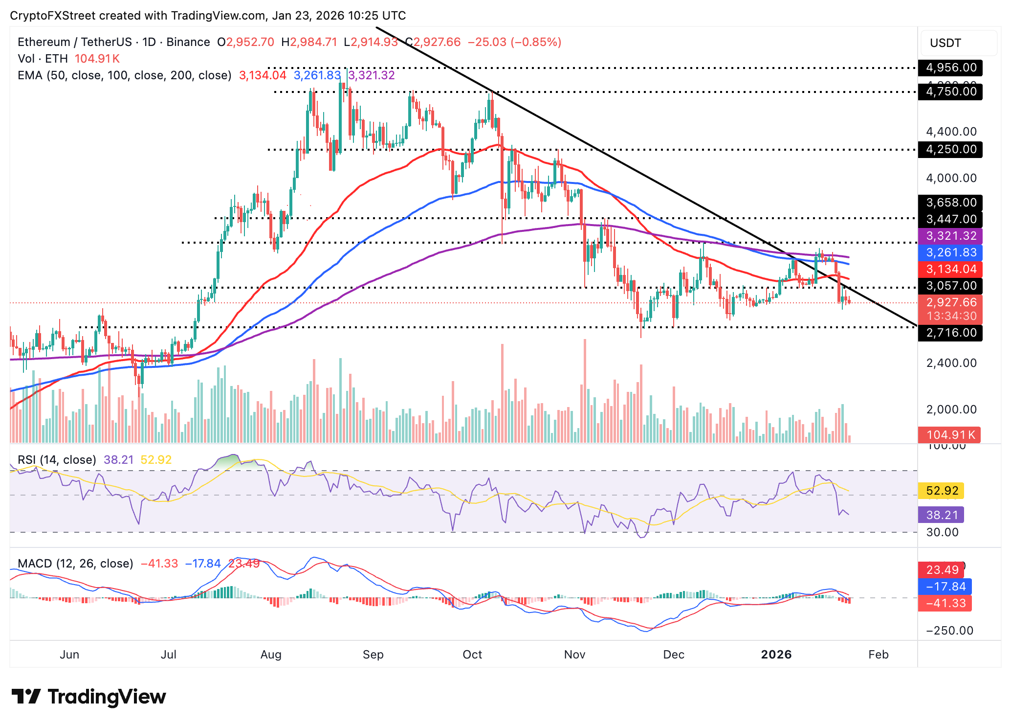 Ethereum holds in a range between $2,900 and $3,000 amid the overall downward trend in the crypto market. The RSI at 38 on the daily chart is accelerating toward oversold territory, as bears tighten their grip.