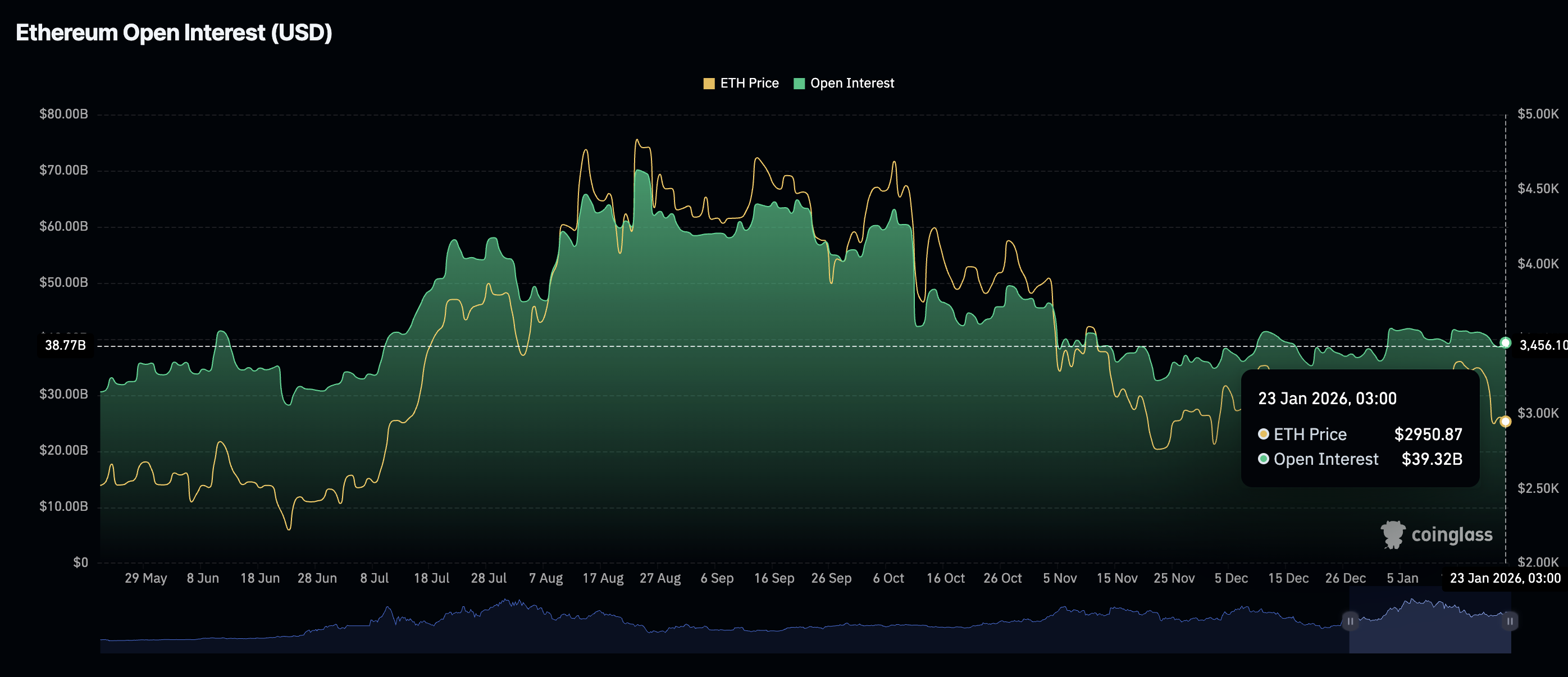 Ethereum is also facing a significant drawdown in the derivatives market amid continued selling pressure. While CoinGlass data shows futures OI increasing slightly to $39.32 billion on Friday, from $38.57 billion the previous day, it remains strikingly below the record of $70.13 billion reached in August.