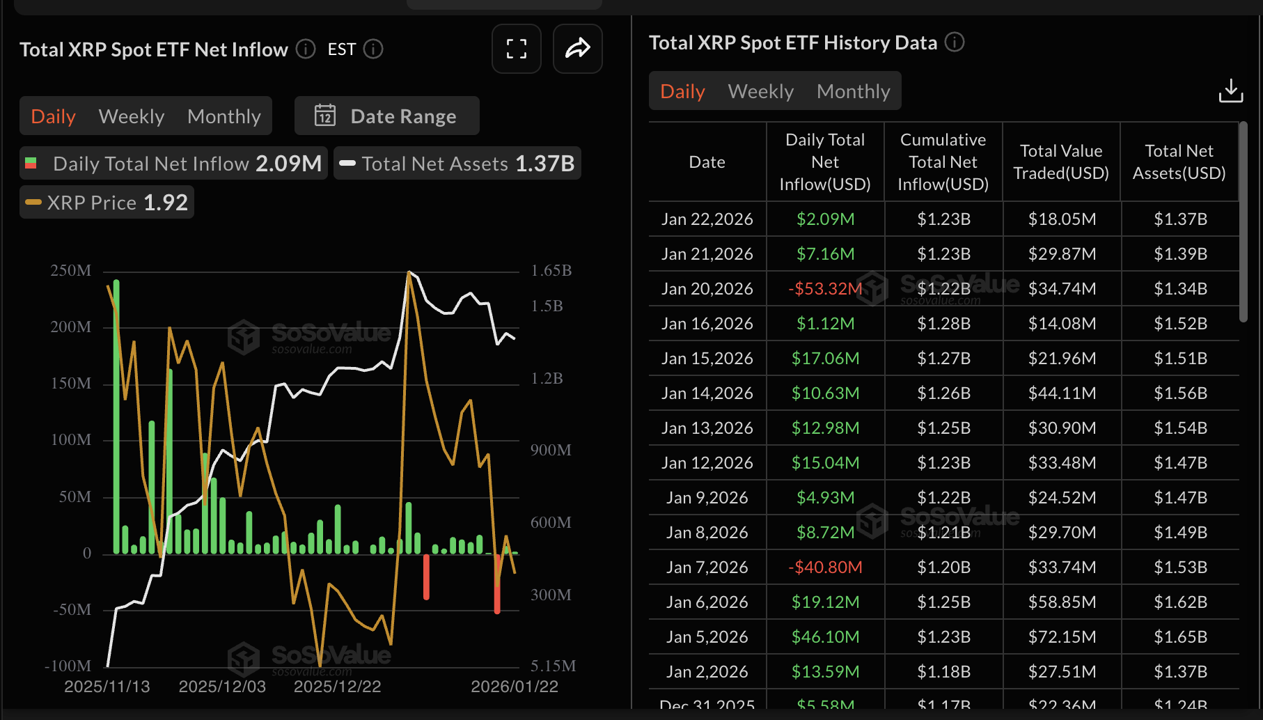 XRP spot ETFs recorded mild inflows of approximately $2 million on Thursday despite risk appetite deteriorating across crypto assets this week. The cumulative total inflow stands at $1.23 billion, and the net assets at $1.37 million, according to SoSoValue data. Demand for US-listed XRP ETFs has remained relatively stable, with only two days of outflows.