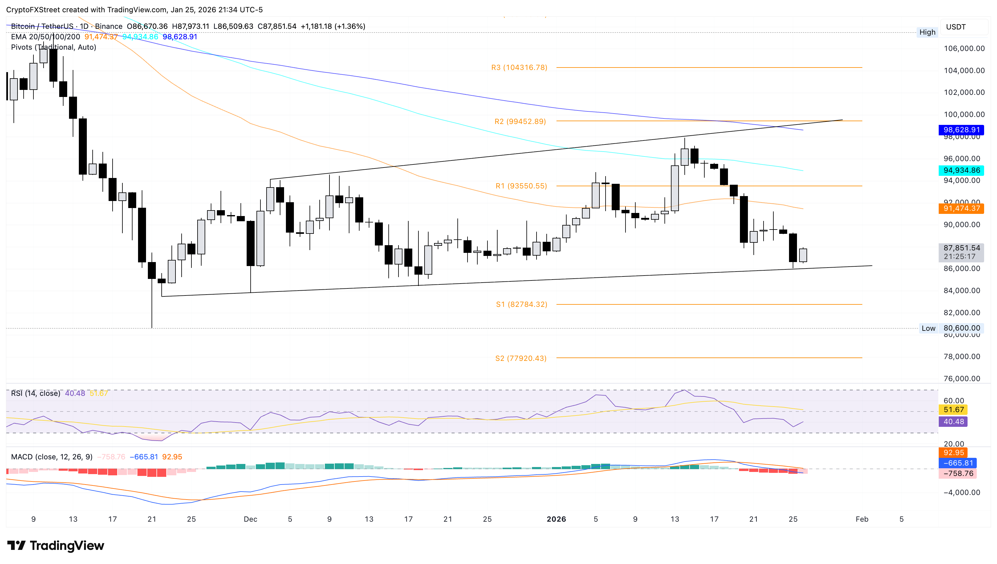 Bitcoin, on the other hand, trades near $88,000 at the time of writing on Monday, recovering over 1% on the day after a nearly 3% decline on Sunday. The rebound in BTC from the ascending trend line connecting the November 22 and December 18 lows near $83,500 maintains the larger expanding channel on the daily chart. BTC would need a close above $90,000 to ease selling pressure, with the 50-day Exponential Moving Average (EMA) at 91,474 acting as initial resistance.