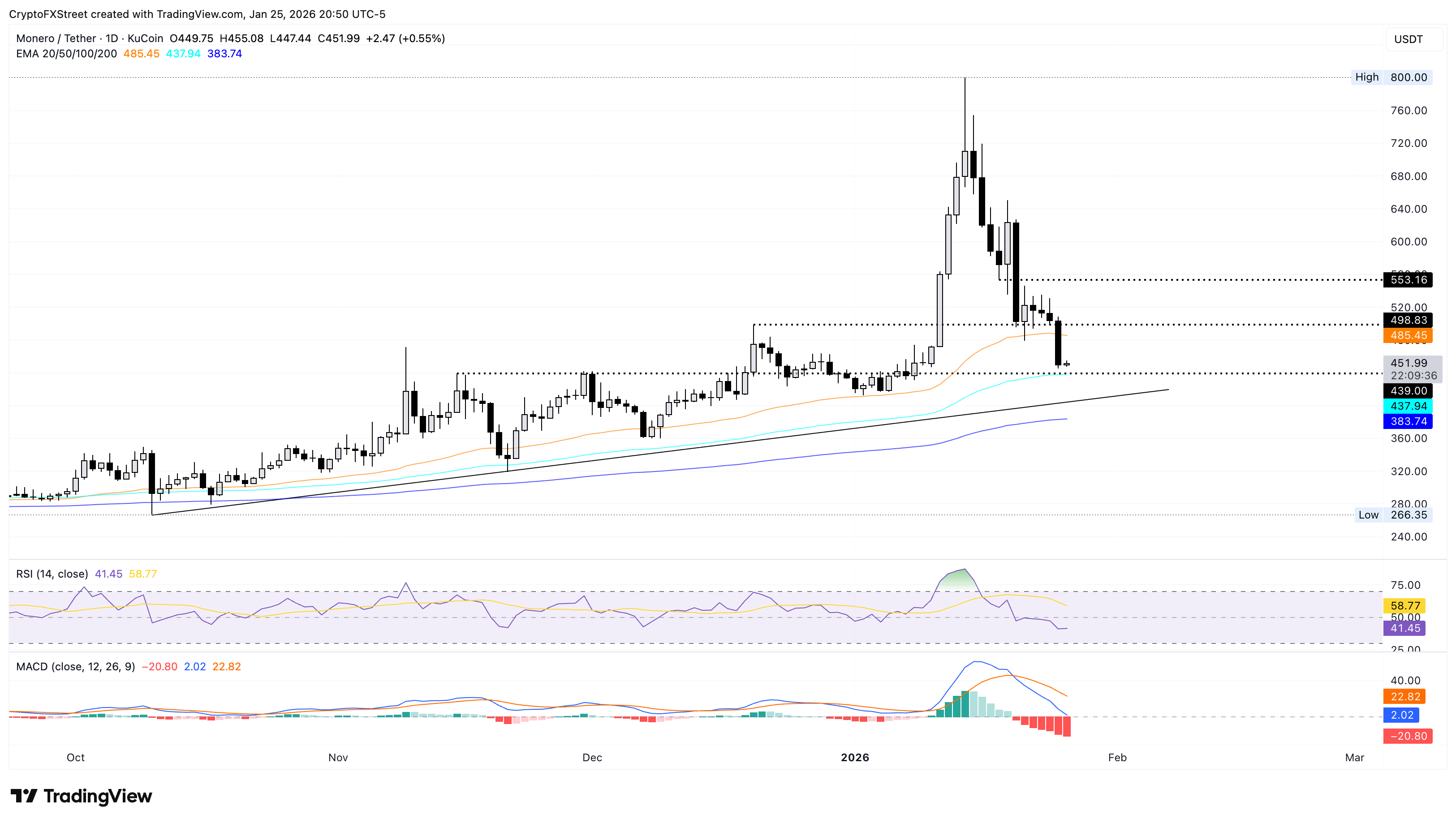 Monero is trading below $500 after a 21% drop last week, suggesting reduced demand for the privacy coin. At the time of writing, XMR hovers around $450 on Monday, stabilizing above the 100-day EMA at $437, after a 10% drop on Sunday. Meanwhile, the 200-day EMA at $383 remains the primary trend floor.