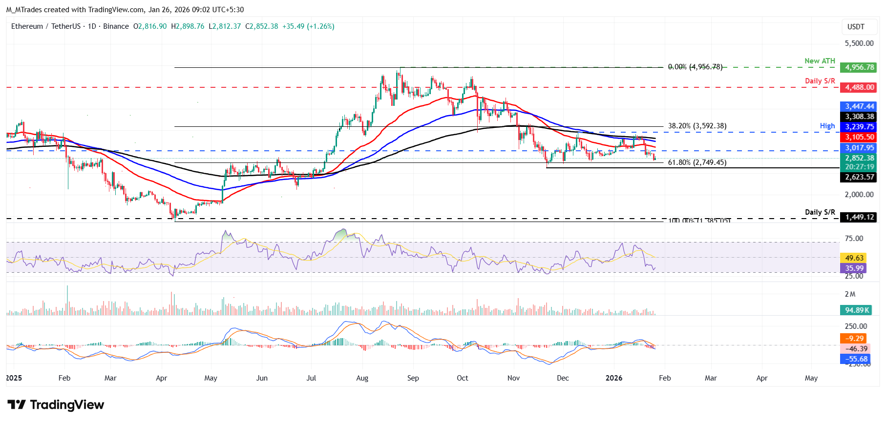 If the 61.8% Fibonacci retracement level at $2,749 holds, ETH could recover toward the daily resistance level at $3,017.