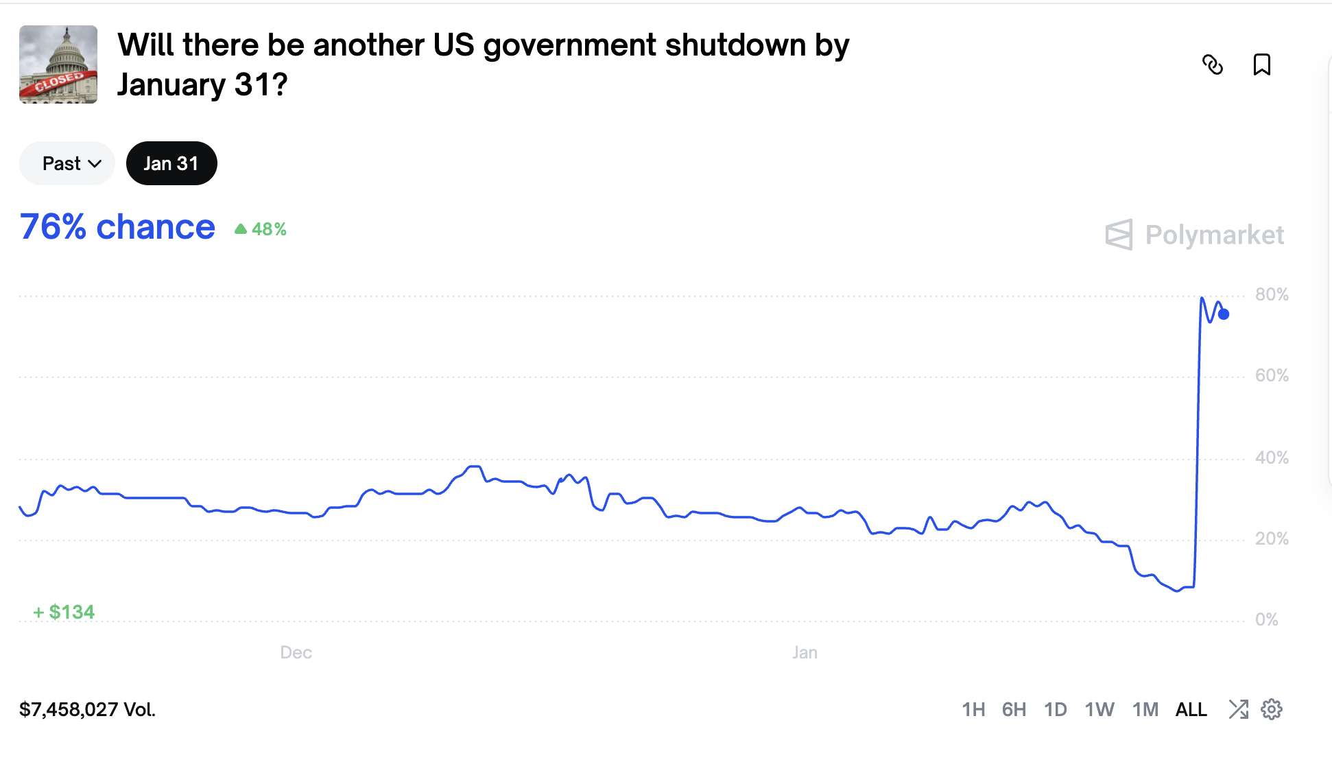 The odds of a partial US government shutdown by the end of the week have increased to 77% on the prediction platform Polymarket. The US Senate is expected to vote on a massive $1.2 trillion package to fund government operations; however, challenges are emerging as Democratic senators withdraw support amid pushback against federal immigration agents, CNBC reports.