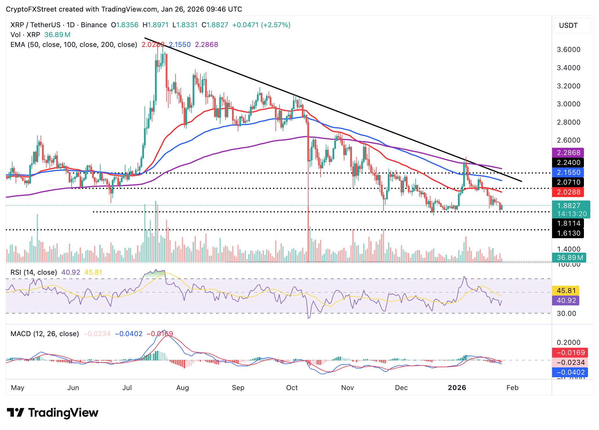Meanwhile, XRP remains below the 50-day EMA at $2.03, the 100-day EMA at $2.16 and the 200-day EMA at $2.29. Besides the moving average cluster capping the upside, it is also sloping downward, emphasising the overall bearish outlook. The MACD indicator on the same chart remains below the signal line, increasing the odds of robust bearish momentum. A correction below Sunday’s low at $1.81 may extend the sell-off down to April’s support at $1.61.