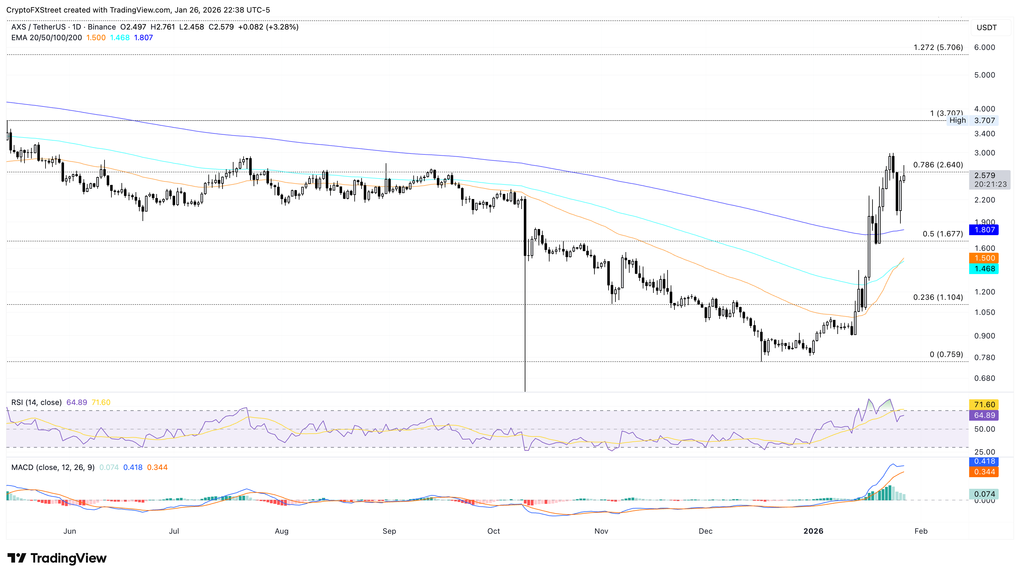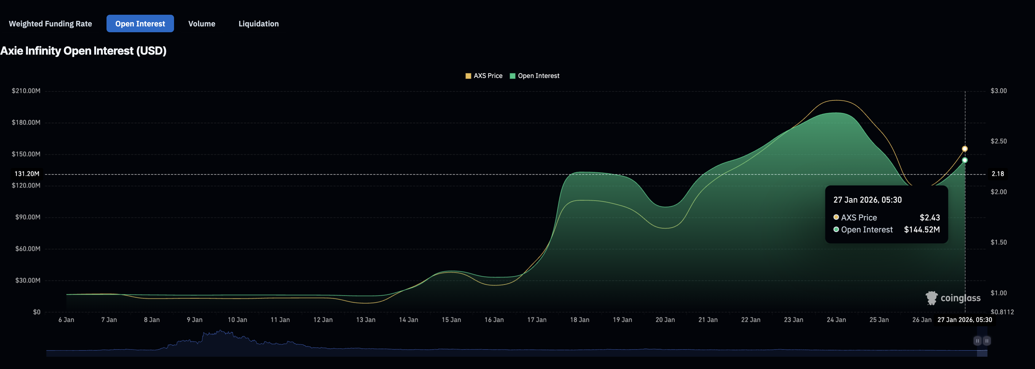 On the derivatives side, the launch of the new bAXS token renewed capital inflows into AXS futures, driving Open Interest to a peak of $189.52 million on Saturday, up from less than $14 million on January 1. At the time of writing, AXS OI stands at $144.52 million, holding levels last seen in May 2022. This surge in the notional value of outstanding AXS contracts reflects increased investor confidence in the gaming token.