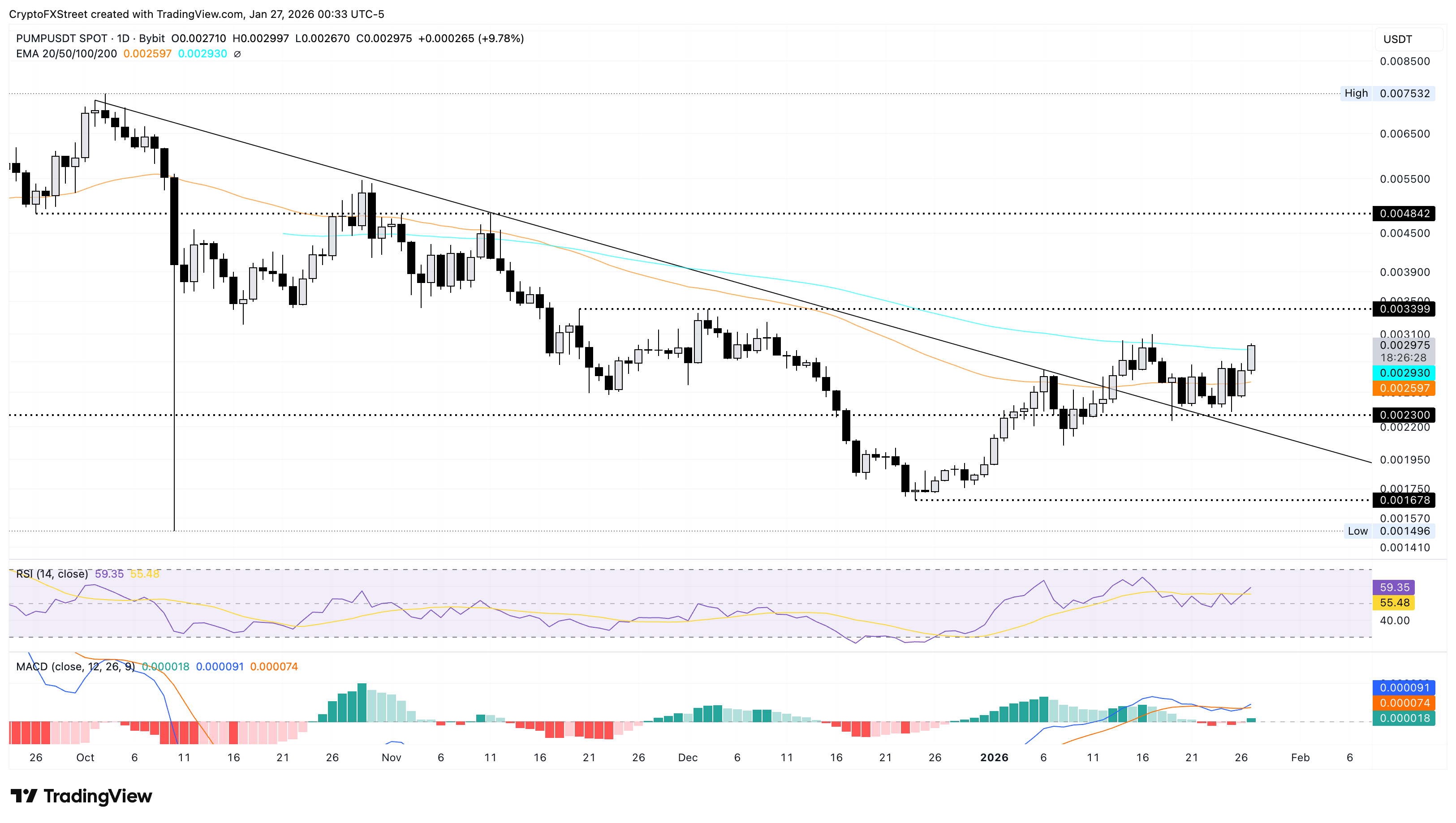 PUMP is crossing above the 100-day EMA at $0.002930 by press time on Tuesday, which previously capped the gains mid-January, making it a make-or-break zone. The rebound in the meme coins launchpad token extends a trendline breakout rally.