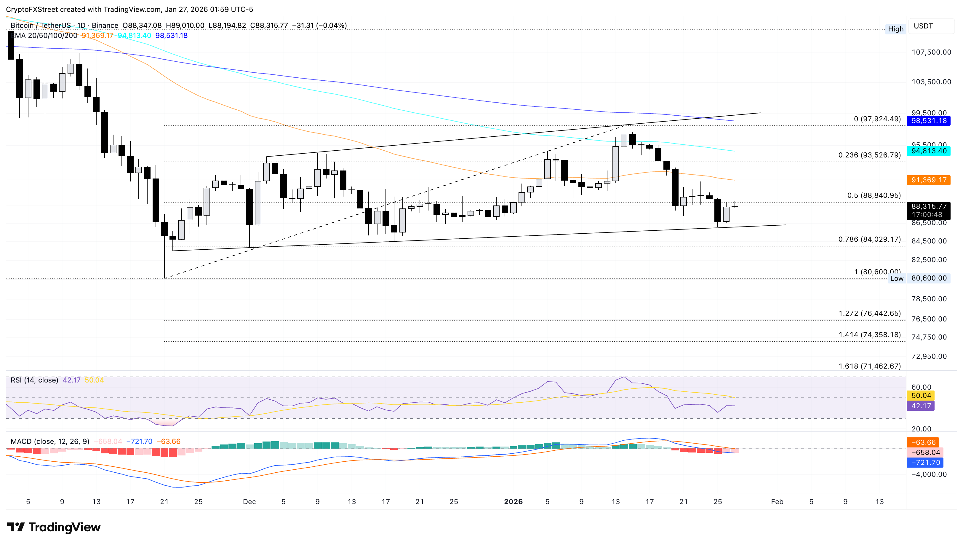 Bitcoin trades below the 50-day, 100-day, and 200-day Exponential Moving Averages (EMAs), reflecting the broader bearish tone. The major crypto struggles to surpass the 50% Fibonacci retracement level at $88,840, measured from the November 21 low at $80,600 to the January 14 high at 97,924.