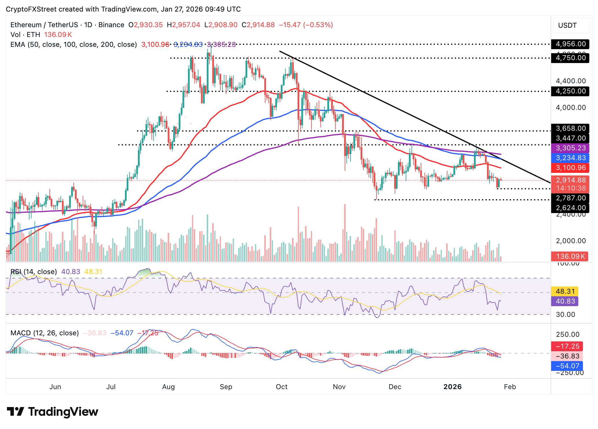 Ethereum edges lower, testing support at $2,900 at the time of writing on Tuesday while extending its multi-month downtrend. The leading altcoin remains under pressure below the 50-day EMA, which acts as immediate resistance at $3,100, followed by the 100-day EMA at $3,234 and the 200-day EMA at $3,305.