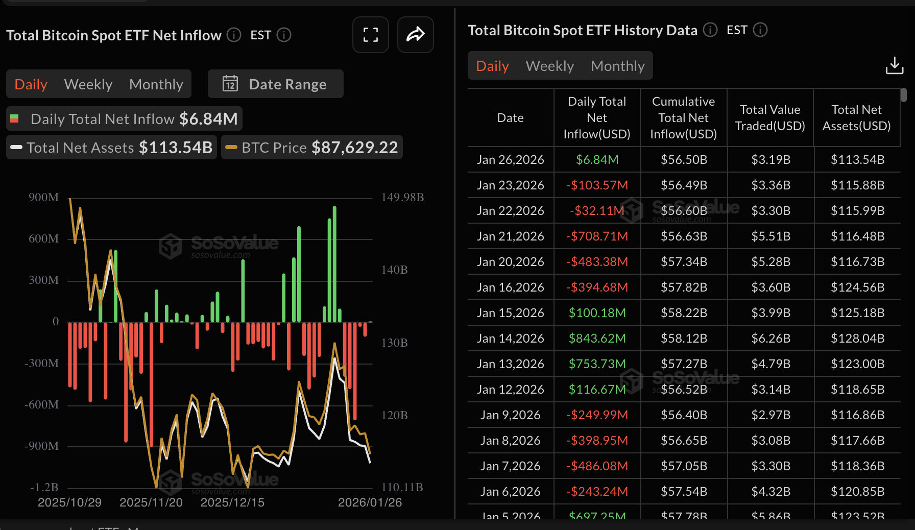 Monday’s mild inflow broke a short-term redemption trend that mirrored risk-off sentiment in the wider crypto market. However, the cumulative inflow remains positive at over $56 billion, while total net assets stand at $113.5 billion.