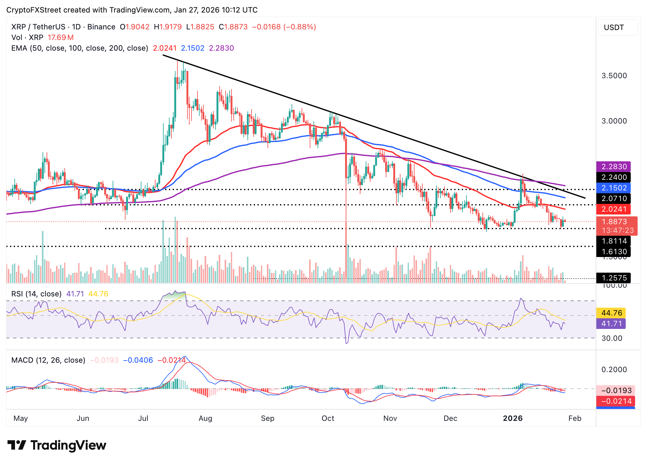 Ripple (XRP) is trading around $1.88 at the time of writing on Tuesday, correcting from the previous day’s high of $1.95. The cross-border remittance token remains under immense pressure amid a weak technical structure.