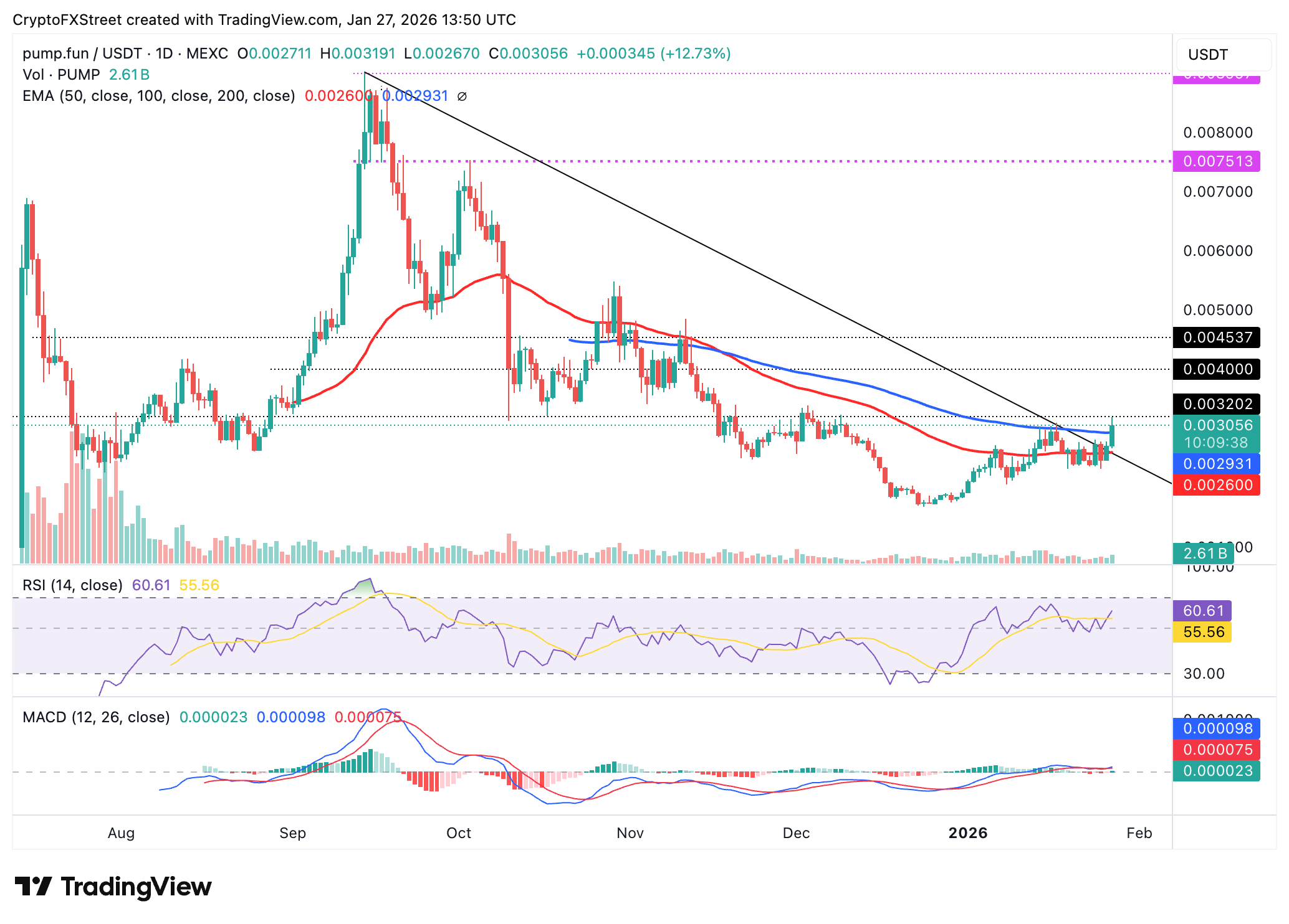 Still, traders should be cautious amid possible profit-taking, microeconomic uncertainty, and geopolitical tensions, which could push PUMP below $0.00300. The 100-day Exponential Moving Average (EMA) is poised to absorb selling pressure at $0.00293 and the 50-day EMA at $0.00260.
