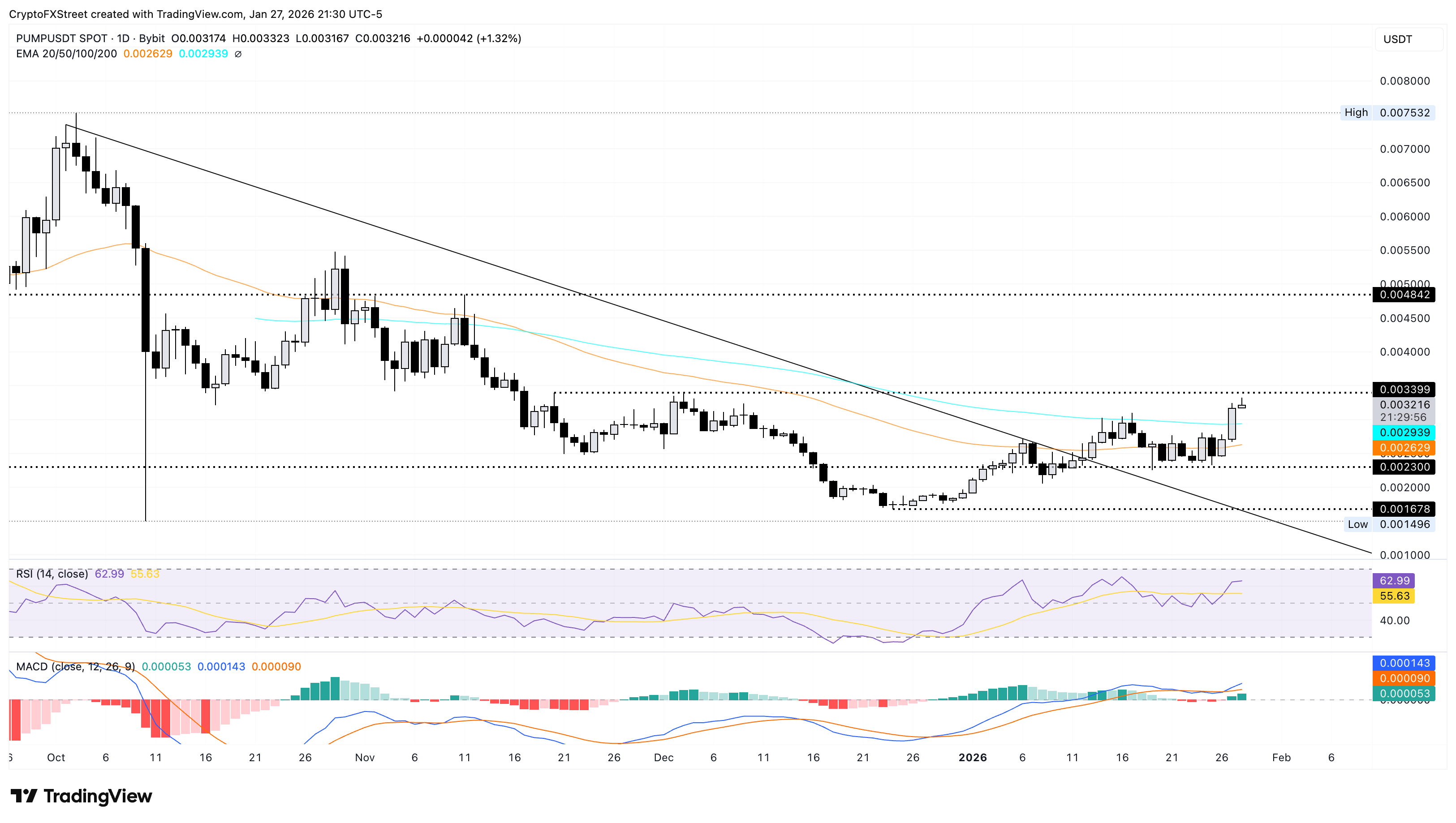Pump.fun trades above $0.003000 at press time on Wednesday, following a 17% hike on the previous day. The Solana-based meme coin launchpad rises toward a key resistance at $0.003399, marked by the November 20 high.