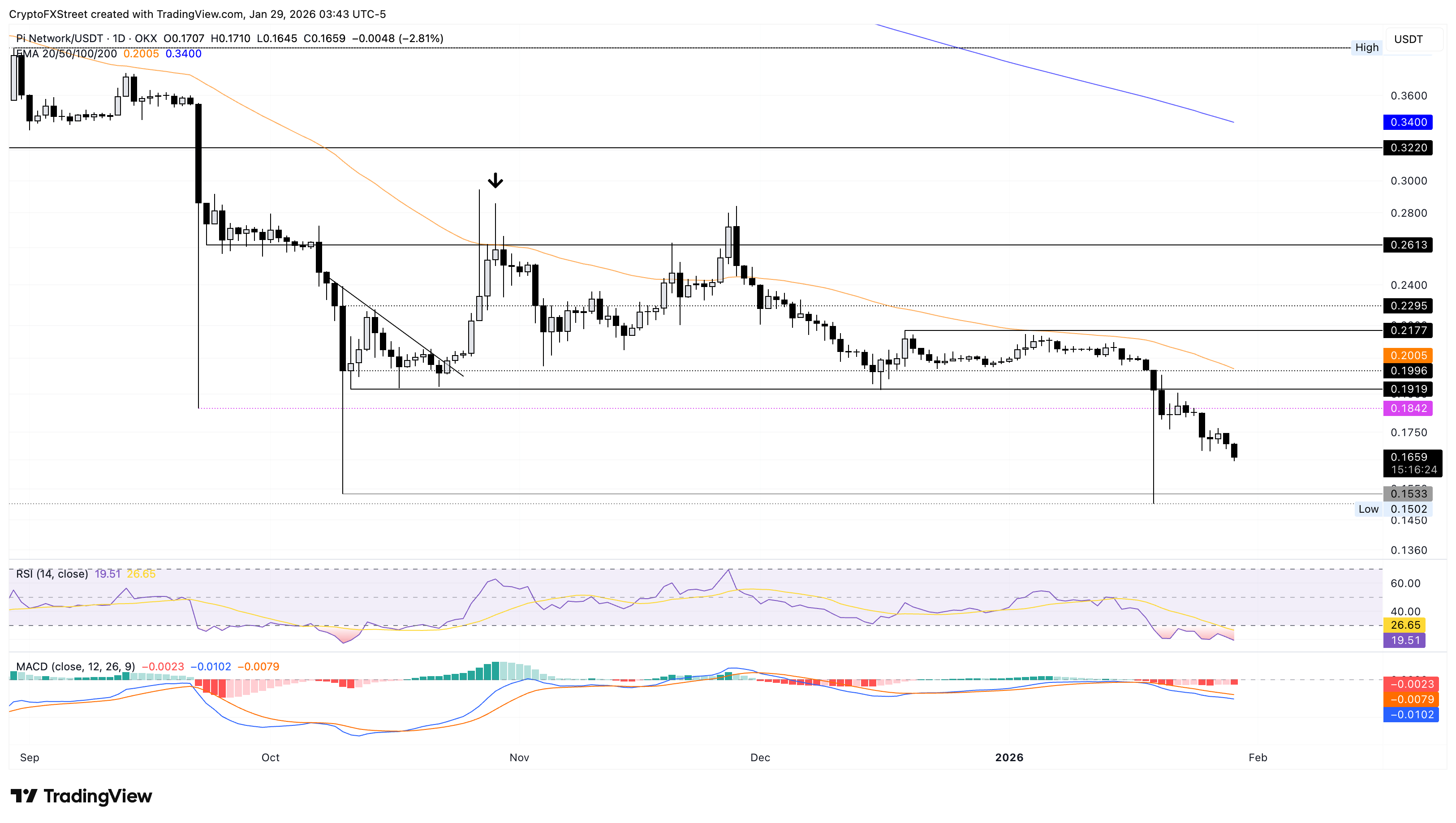 Pi Network trades below $0.1700 on Thursday, extending the broader decline so far this month by roughly 20%. PI remains in support-discovery mode as it approaches the zone between $0.1533 and $0.1502, defined by the October 10 and January 19 lows, respectively.