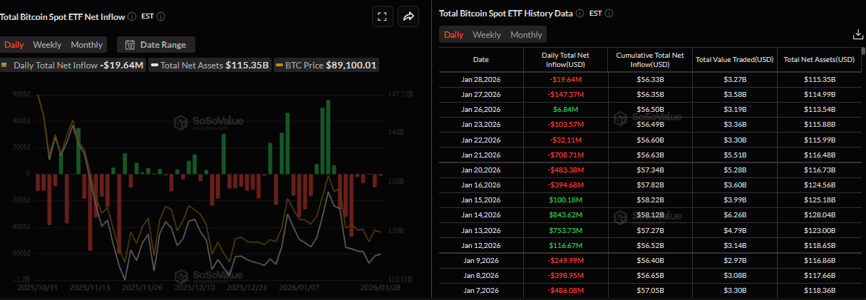 Bitcoin (BTC) price slips below $88,000 at the time of writing on Thursday, after being rejected at a key level the previous day. The price correction followed the Federal Reserve’s (Fed) decision to keep interest rates steady on Wednesday, and the Fed Chair Jerome Powell's cautious tone capped BTC’s upside. In addition, rising geopolitical tensions between the US and Iran and lingering concerns over the Fed’s independence continue to dampen risk appetite, limiting Crypto King’s recovery.