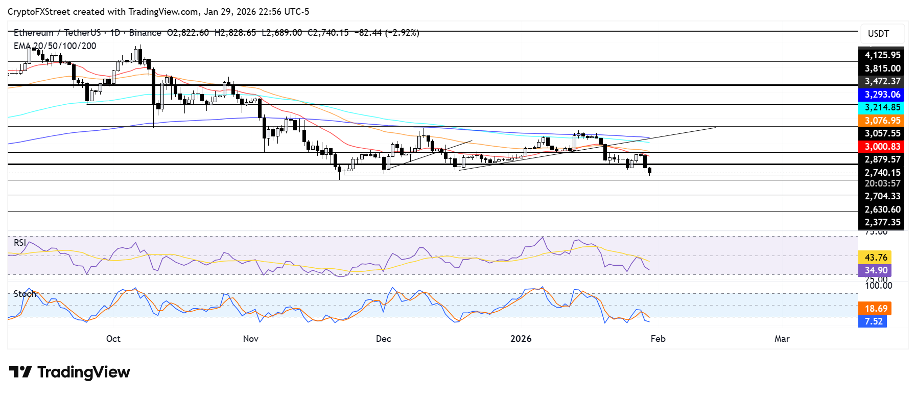 ETH briefly broke the support level near $2,700, following a rejection at the $3,060 resistance, which is strengthened by the 20-day Exponential Moving Average (EMA). A failure to hold $2,700 could push ETH toward $2,625, which served as a support during a major price decline last November. Further down is the $2,380 support level.