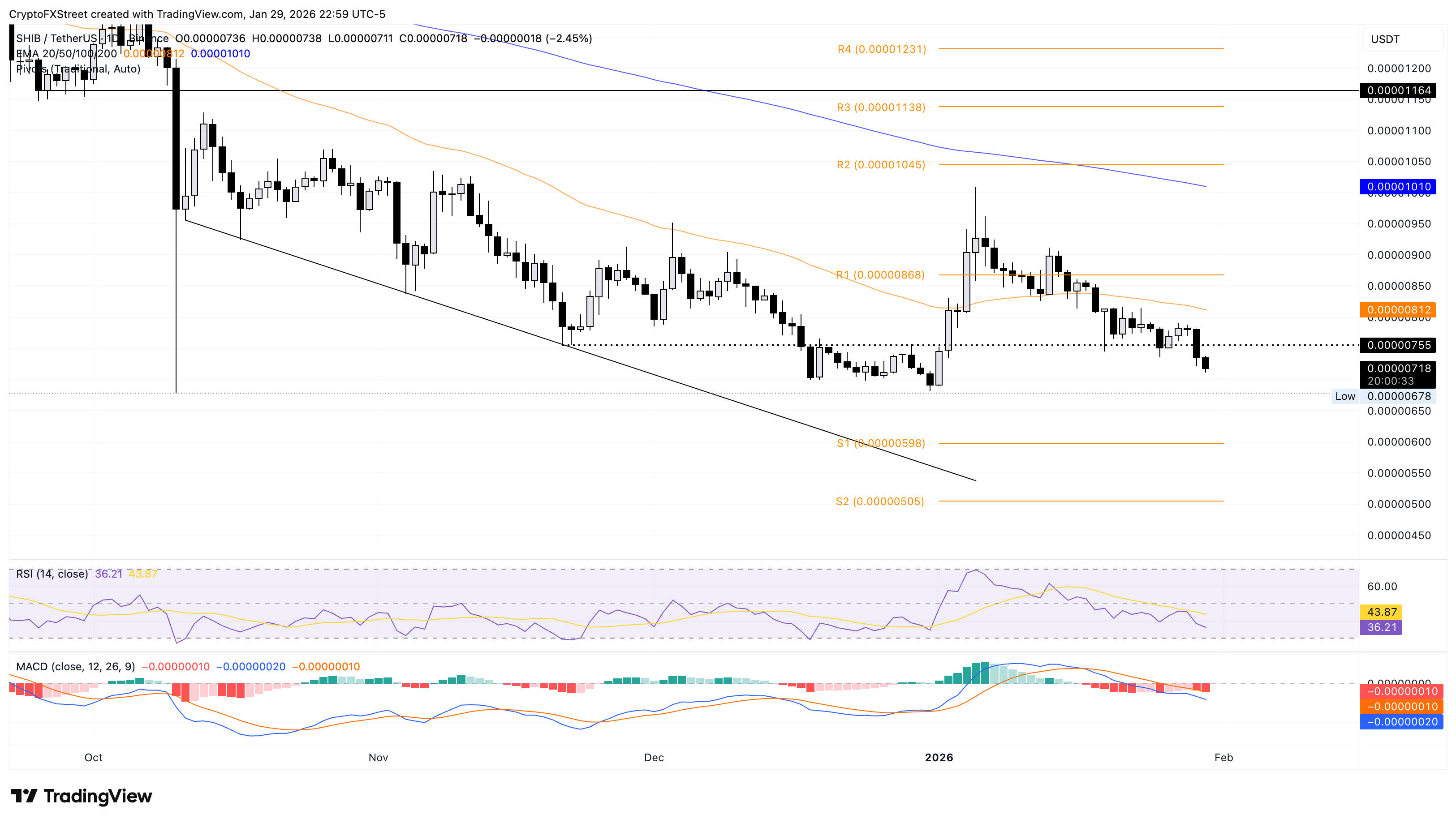 Shiba Inu remains below the falling 50-day Exponential Moving Average (EMA) and a declining 200-day EMA, with the shorter moving average below the longer one, creating a bearish setup. At the time of writing, SHIB is down 2% on Friday, building on the 5% loss from Thursday.