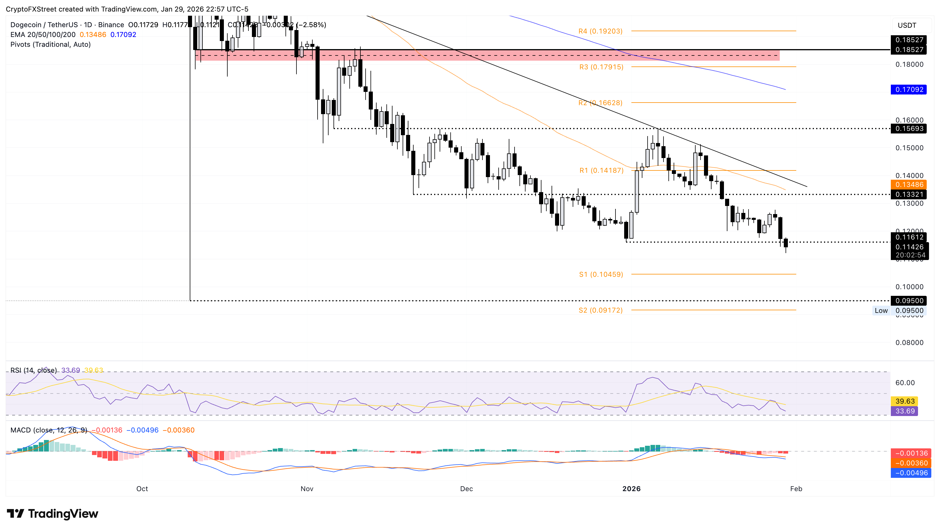 • Dogecoin drops over 2% on Friday, extending a downfall below December’s low.