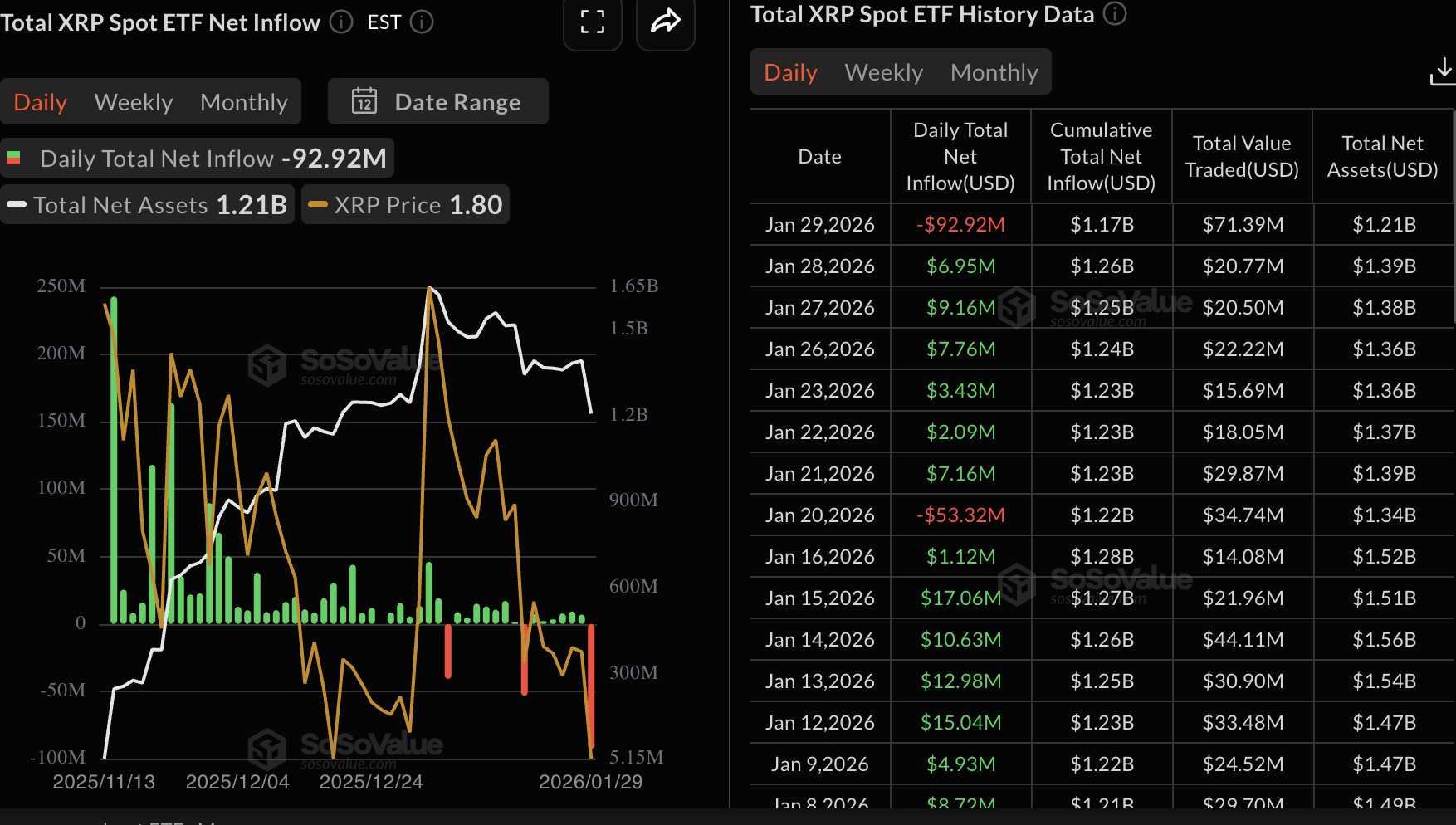 XRP spot ETFs recorded the largest single-day outflow of nearly $93 million on Thursday, reducing the cumulative inflow to $1.17 billion and net assets under management to $1.21 billion. ETF flows serve as a gauge for market sentiment, with large or steady outflows indicating that investors lack confidence in XRP amid heightened Volatility.