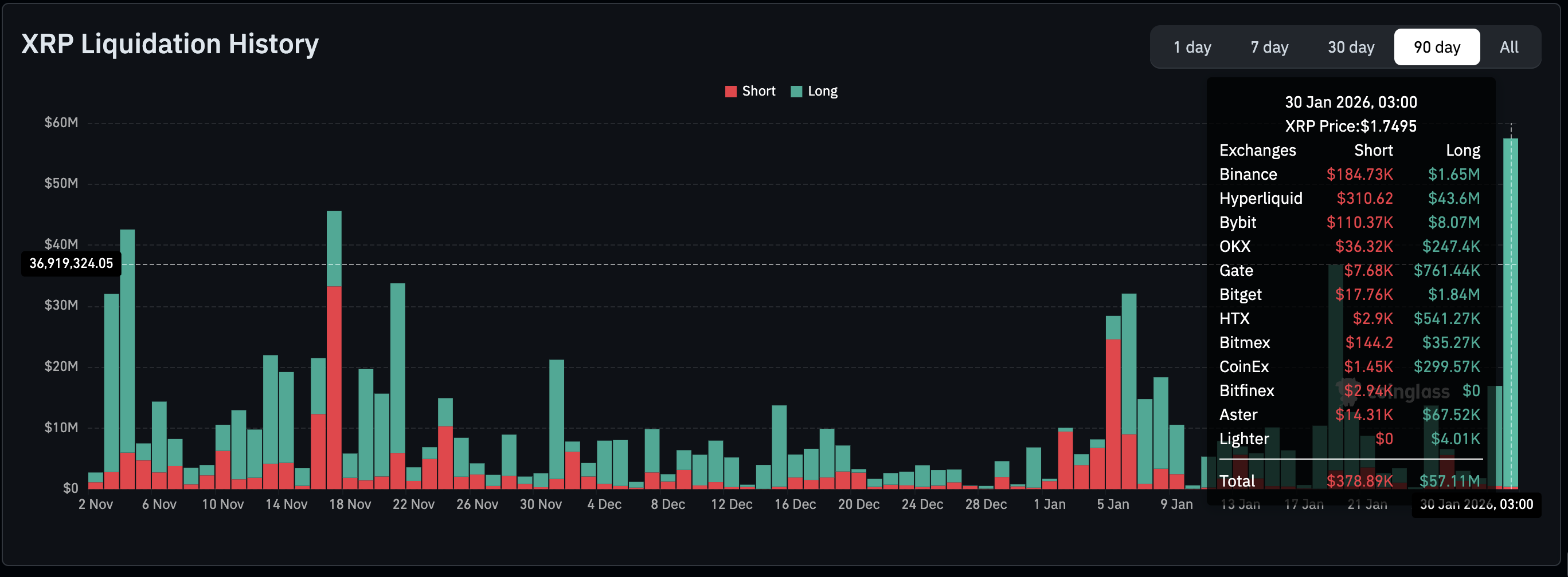 • Leverage XRP traders face the highest liquidation in three months, totalling $57 million, as retail interest wanes.