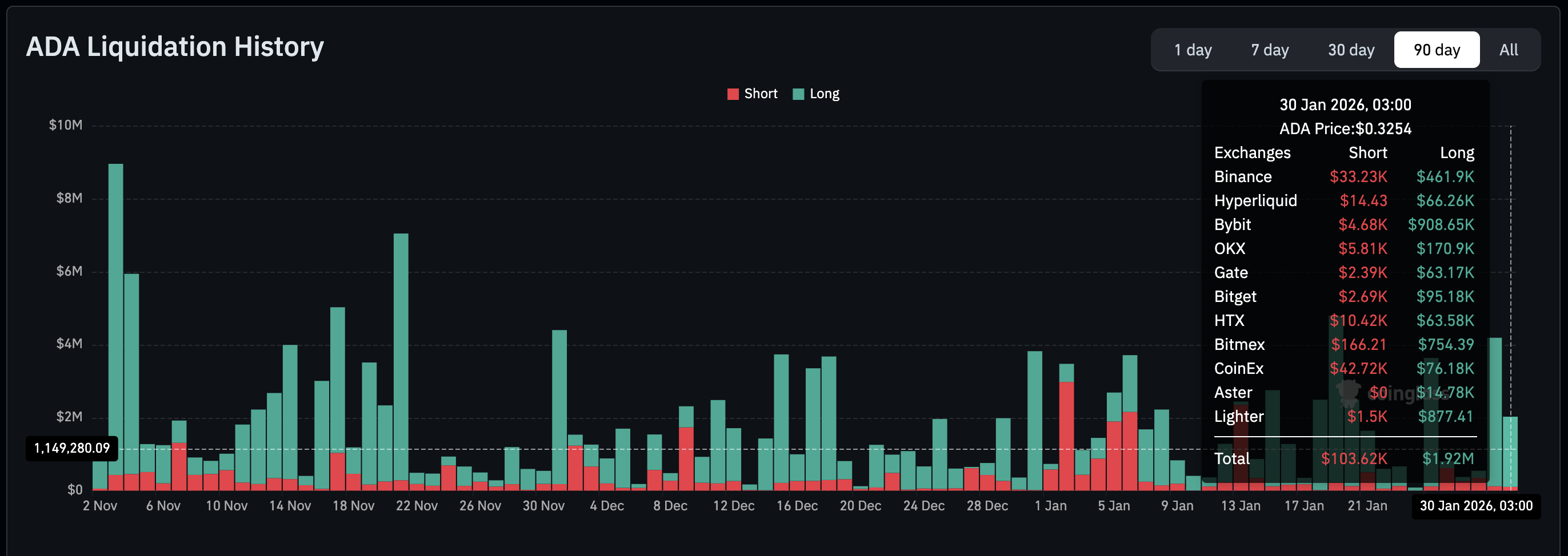 Cardano is down 11% from the week's open at $0.36 and 2% from the daily open at $0.33, reinforcing the overall bearish outlook. Leverage traders are counting losses, as long positions liquidated reached nearly $2 million on Friday, down from approximately $4 million on Thursday. The liquidation of long positions often fuels the downtrend.