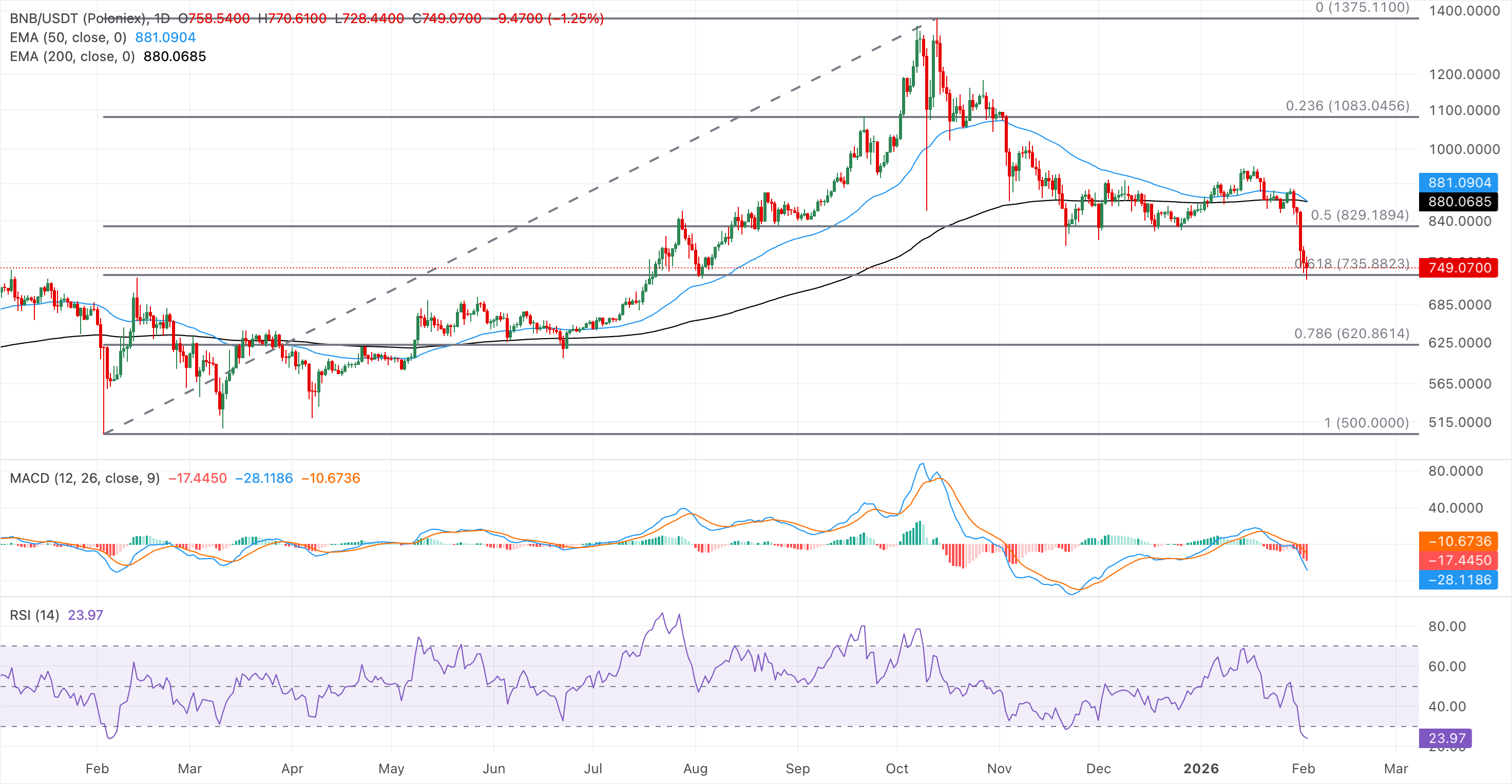 The sell-off in BNB takes short-term support at the 61.8% retracement at $735, measured between the February 2025 low at $500 and the October 2025 high at $1,375. If the exchange token slips to a daily close below $735, the 78.6% Fibonacci retracement level at $620 could serve as the next support level.