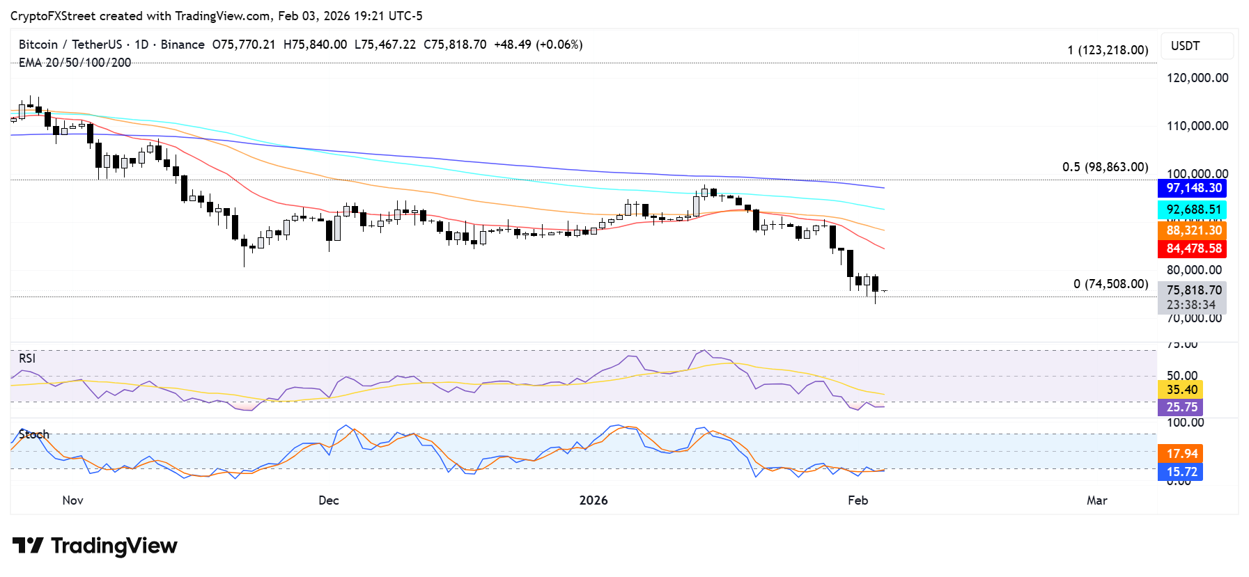 The top crypto briefly declined more than 5% over the past 24 hours, sliding below $73,500 before quickly recovering above $75,000 at the time of publication. Over the past two weeks, Bitcoin has lost more than 23%, eroding about $401 billion in market capitalization.