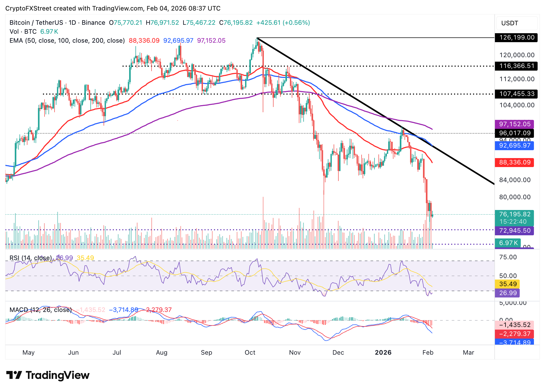 Bitcoin is delicately holding short-term support at $76,000 as the Relative Strength Index (RSI) rises to 27 within oversold territory on the daily chart, indicating that while selling pressure is apparent, bears are overextended.