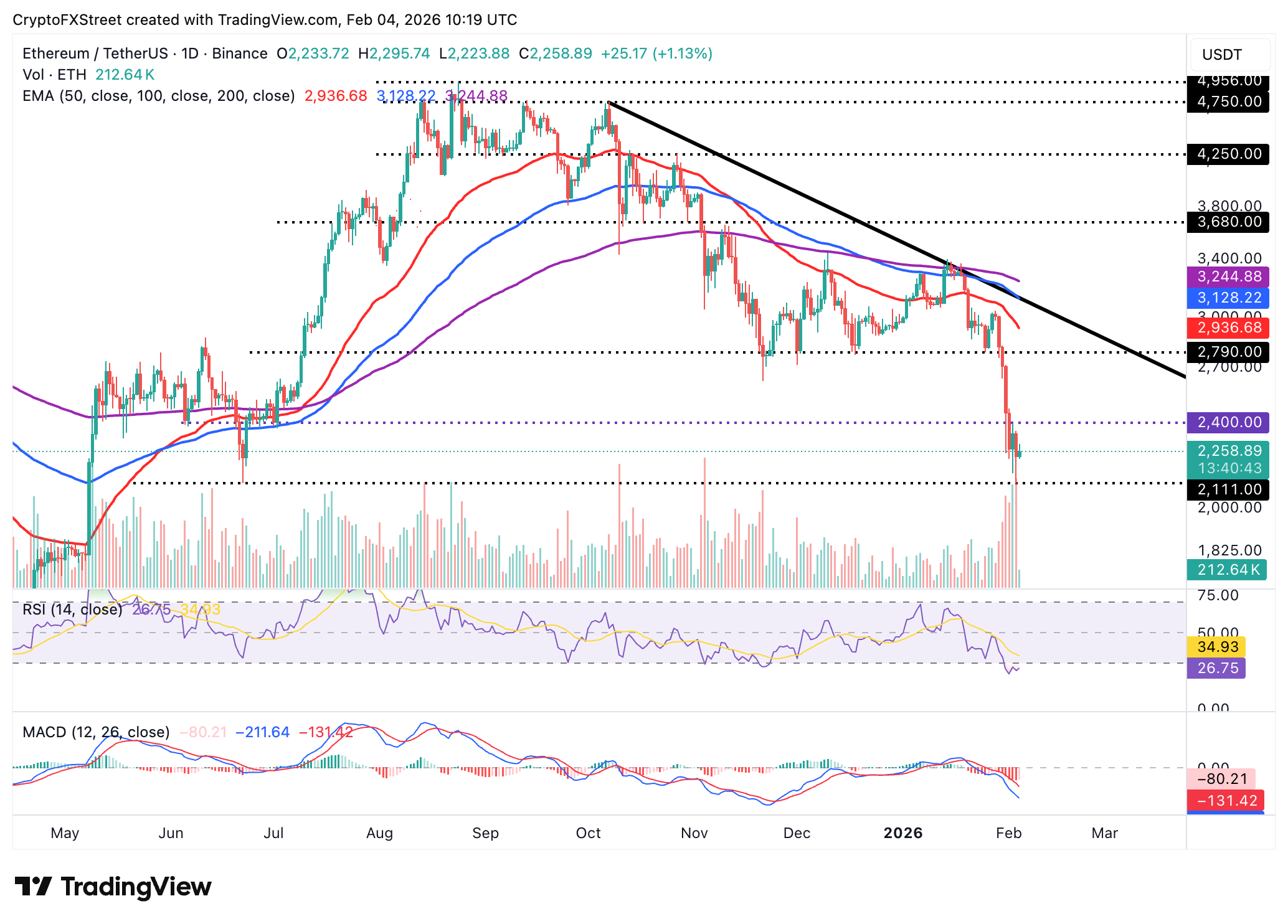 Ethereum is advancing toward the $2,300 resistance at the time of writing on Wednesday, after testing support at $2,110 on Tuesday. A slight increase in the RSI to 27, within oversold territory on the daily chart, suggests a potential decrease in bearish momentum. Traders will watch for the RSI to rise toward the midline to confirm a steady price recovery targeting the next key hurdle at $2,400.