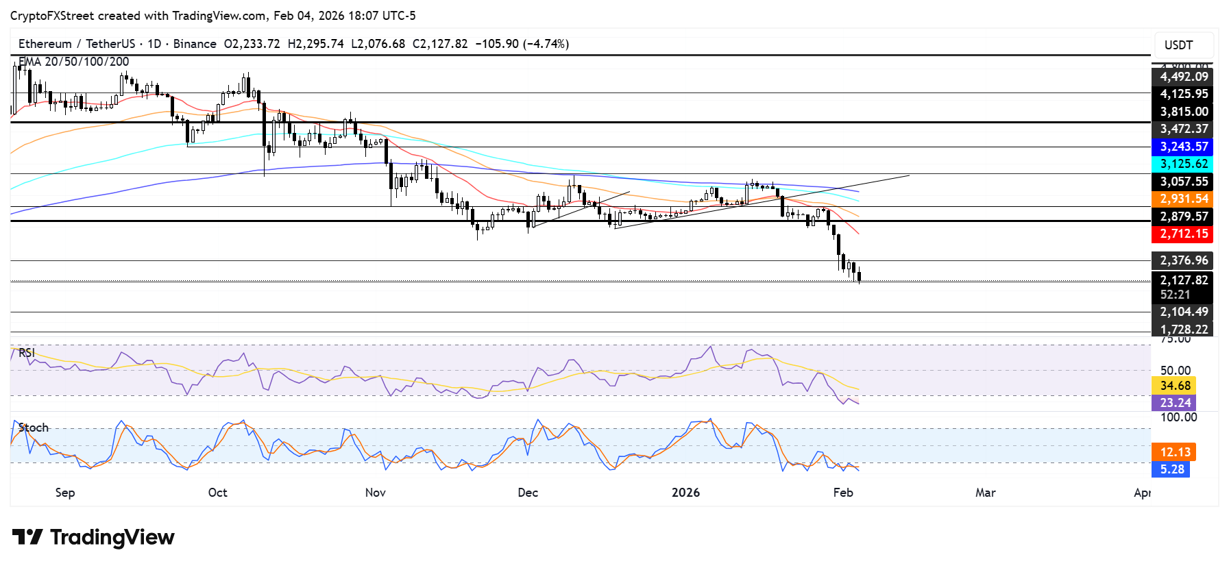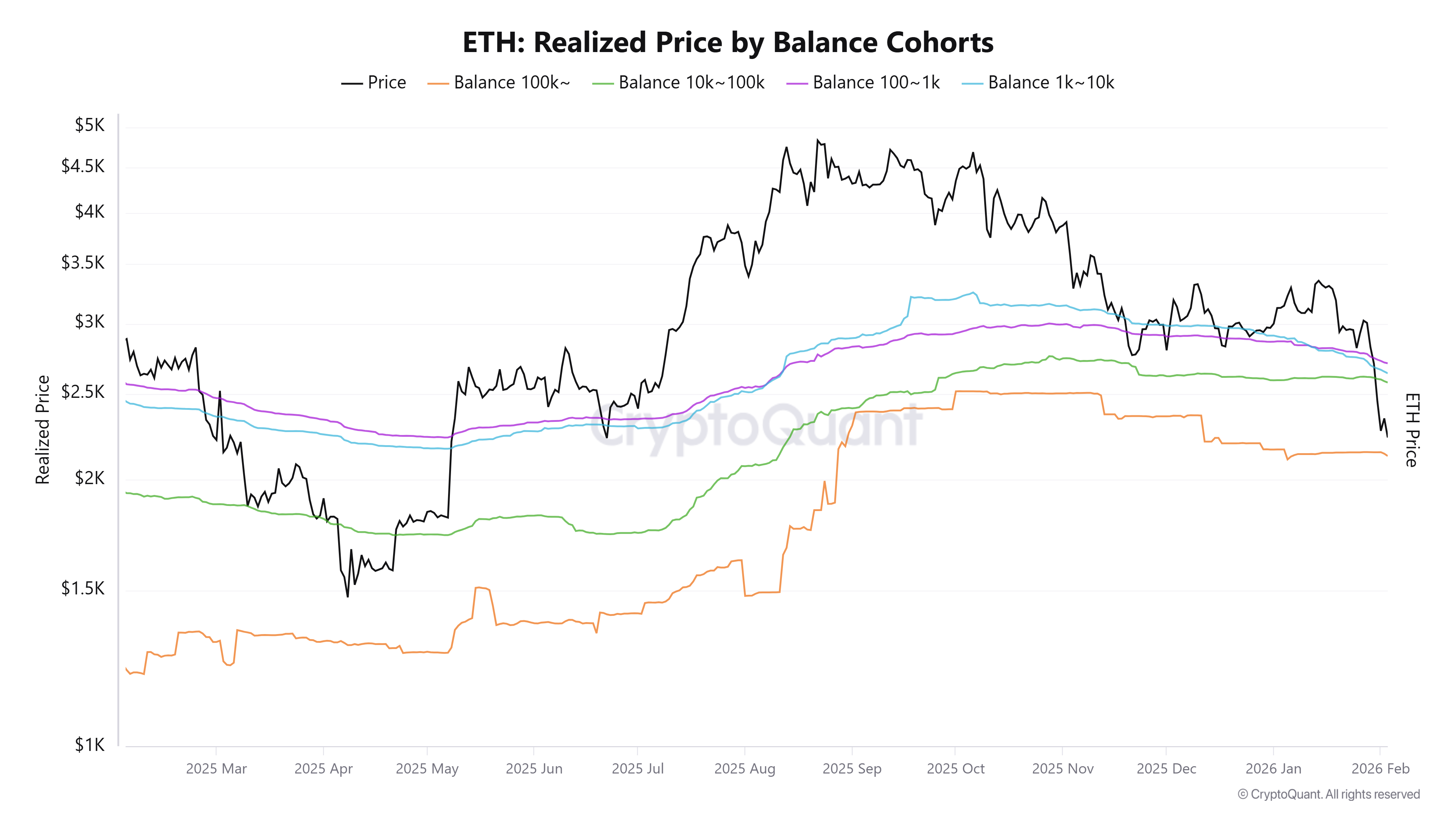 Ethereum (ETH) extended its decline on Wednesday, dropping more than 5% over the past 24 hours toward the $2,100 level, which is below the $2,310 average cost basis or realized price of investors, according to CryptoQuant's data.