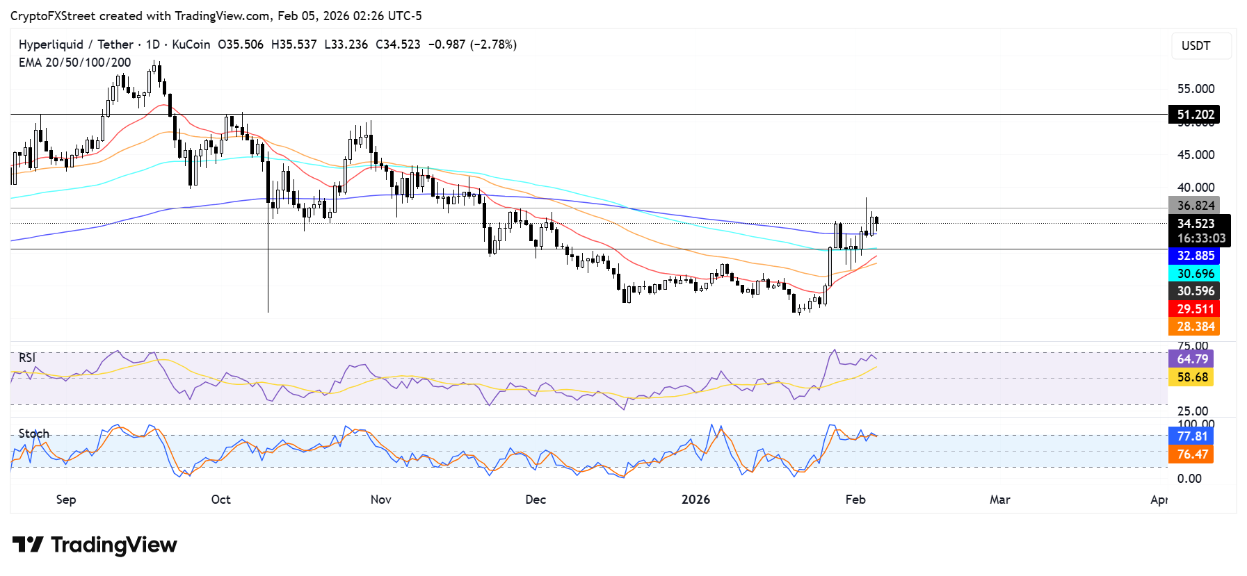 Following the announcement, HYPE bounced off the 200-day Exponential Moving Average (EMA), gaining over 8% on Wednesday. But momentum is fading, as HYPE has tapered some of those gains after a rejection near $36. HYPE is trading at $34.6 at the time of publication, up 3% over the past 24 hours.