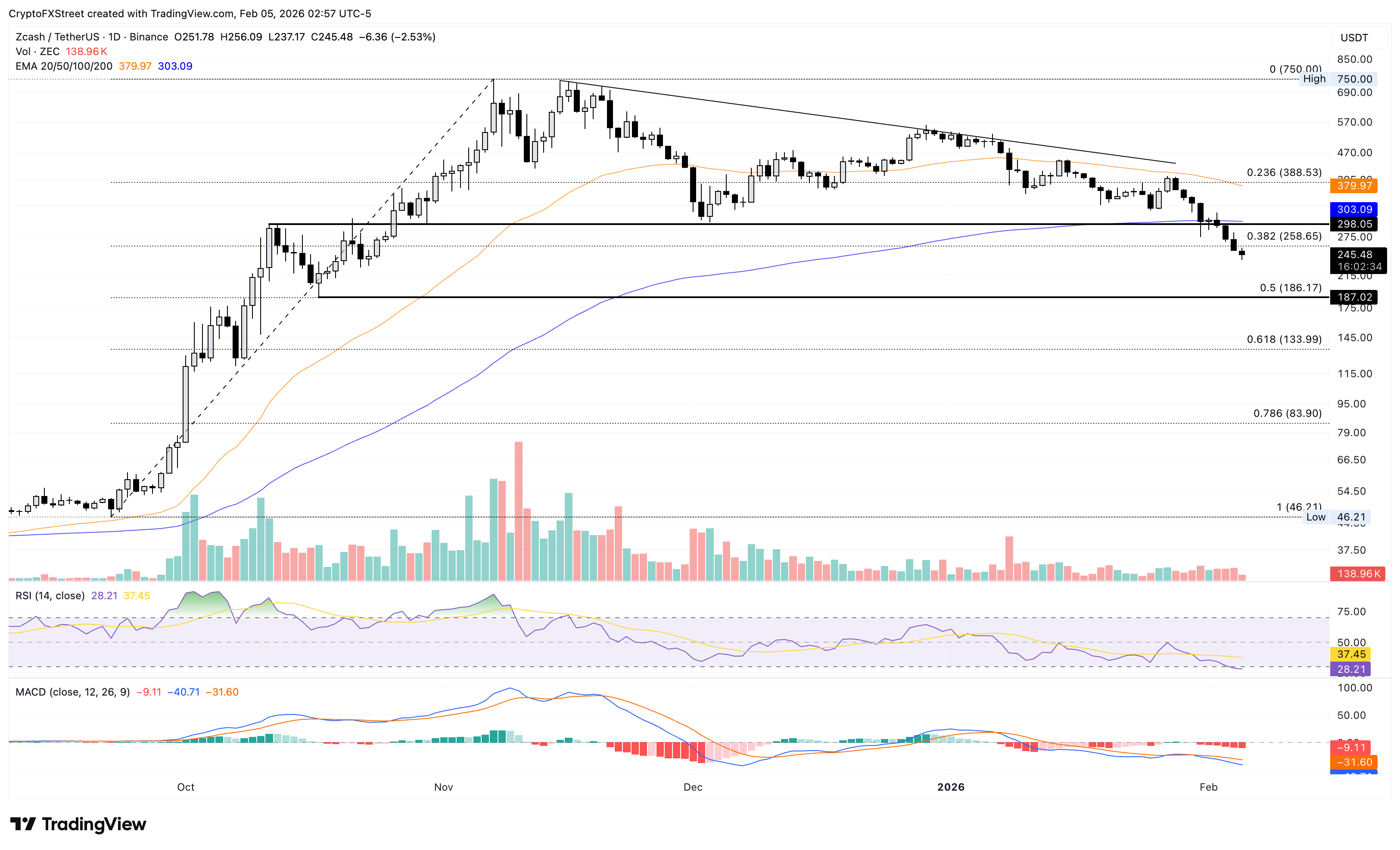 Zcash trades below $250 at press time on Thursday, recording a decline of more than 35% since January 28. The ZEC token trades below the 200-day Exponential Moving Average (EMA) at $303, with the 50-day EMA sloping lower, suggesting a short-term bearish bias.