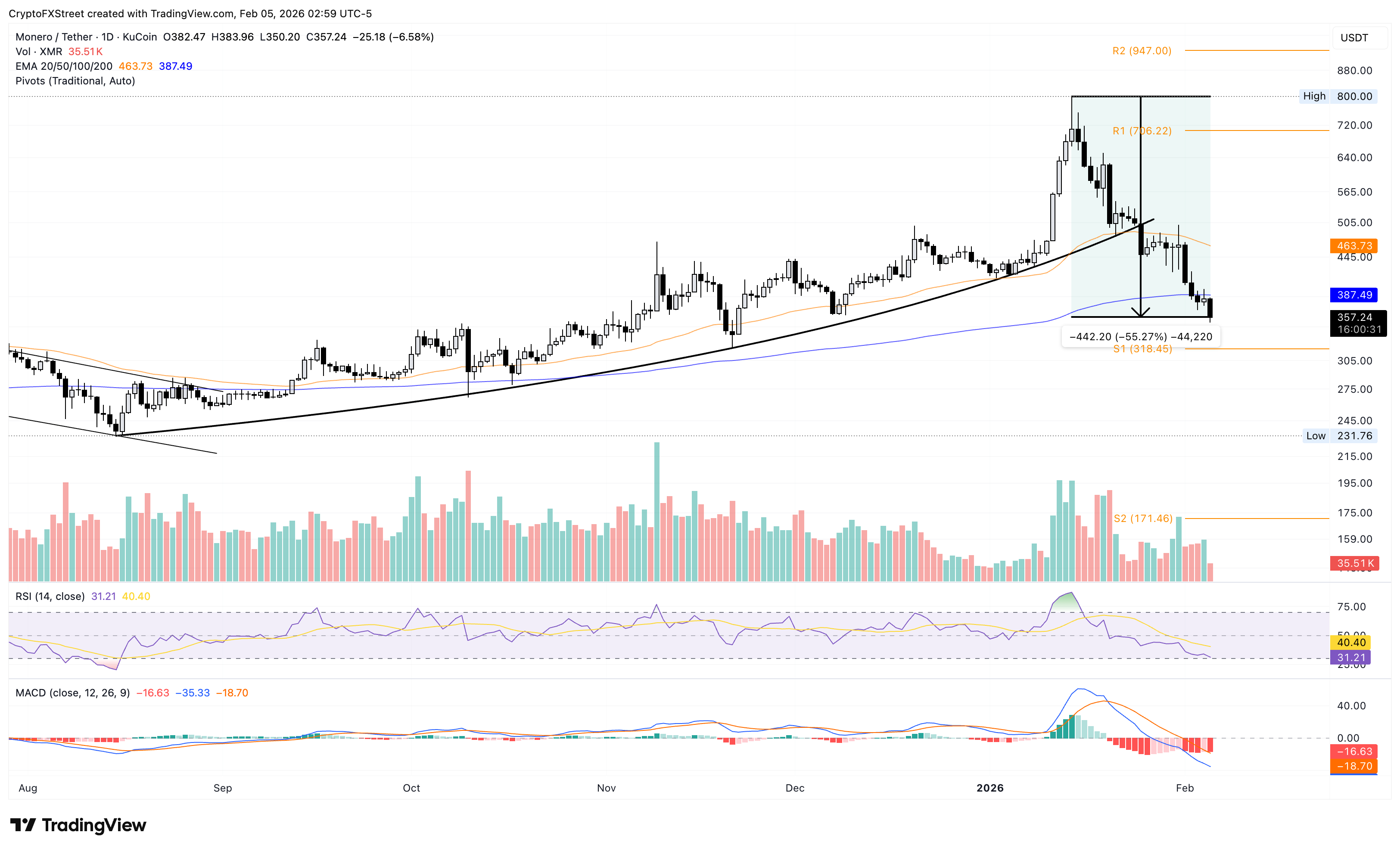 On the other hand, Monero is down 6% on Thursday, extending below the 200-day EMA at $387. Similar to ZEC, the 50-day remains above the 200-day but slopes lower, reaffirming bearish bias.