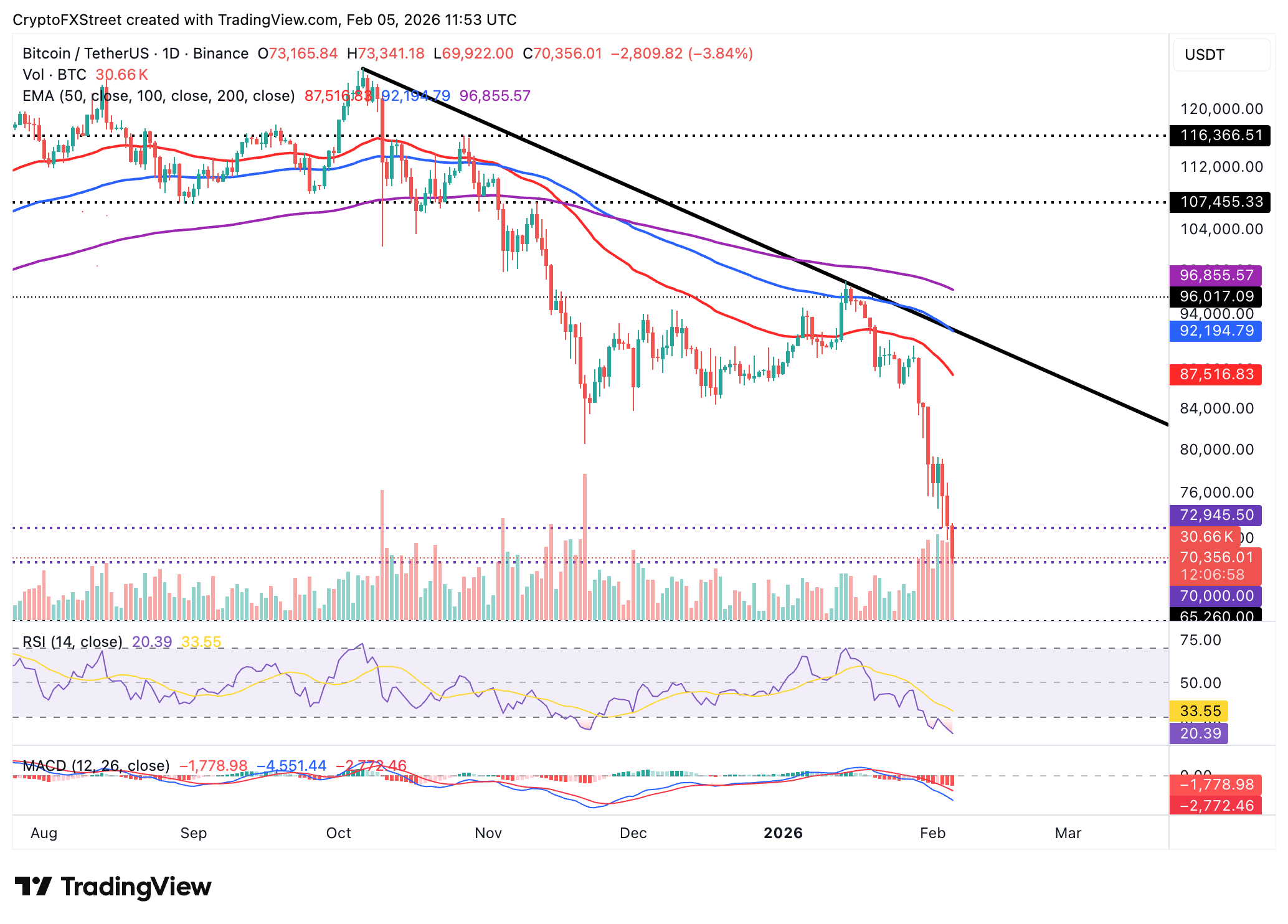 Bitcoin trades under aggressive bearish hands toward the psychological $70,000 threshold, weighed down by a weakening technical structure. The Relative Strength Index (RSI) has extended its decline to 20, placing it in oversold territory on the daily chart, as sellers maintain the bearish outlook.
