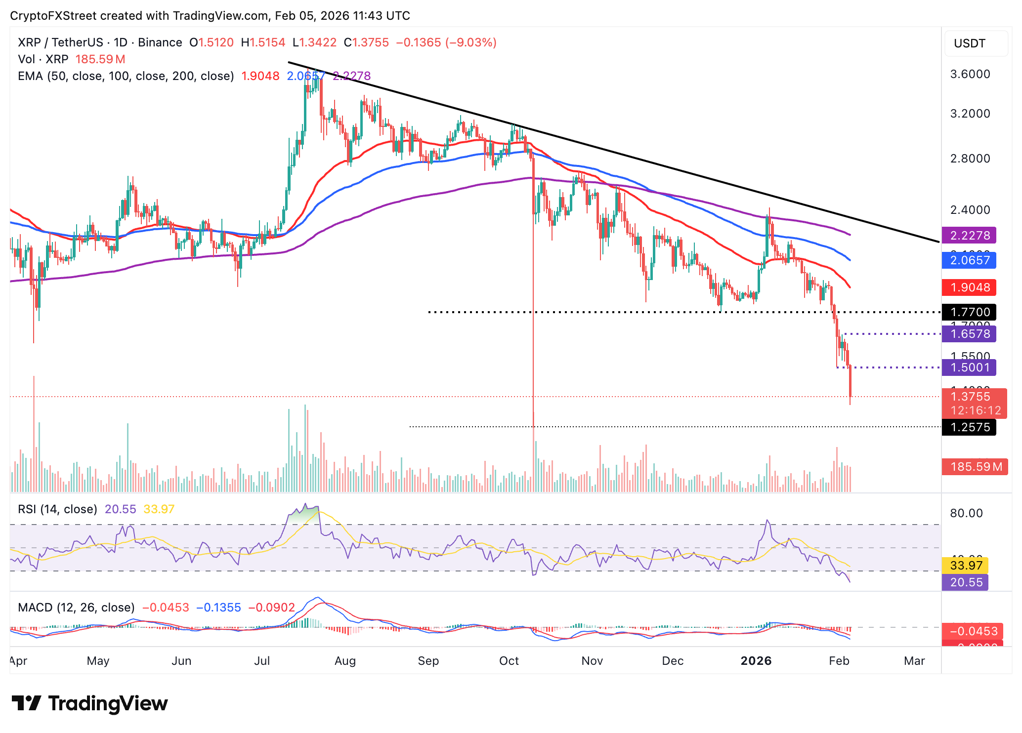 The RSI at 21 in oversold territory on the daily chart reinforces the bearish grip, while the MACD indicator remains below its signal line on the same chart, signaling investors to sell XRP. Red histogram bars continue to expand below the zero line, emphasizing the deteriorating technical picture.