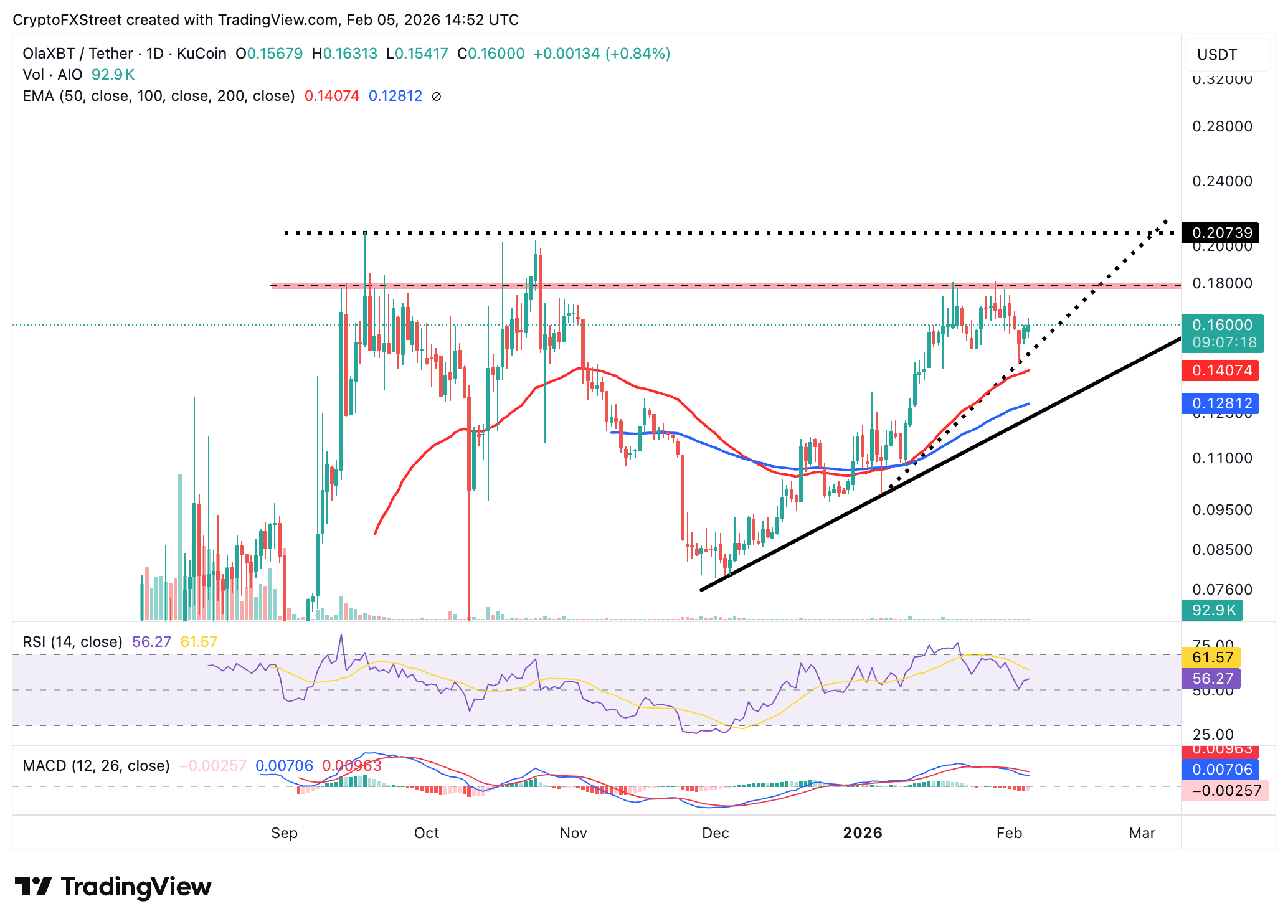 OlaXBT also edges up, trading above $0.16 at the time of writing on Thursday, reflecting increased interest from traders seeking opportunities in newly launched AI tokens. AIO holds well above the 50-day EMA, providing support at $0.14 and the 100-day EMA at $0.13. The accelerated trendline (dotted) is poised to absorb selling pressure if the trend reverses, while the slow trendline is positioned below the 100-day EMA.