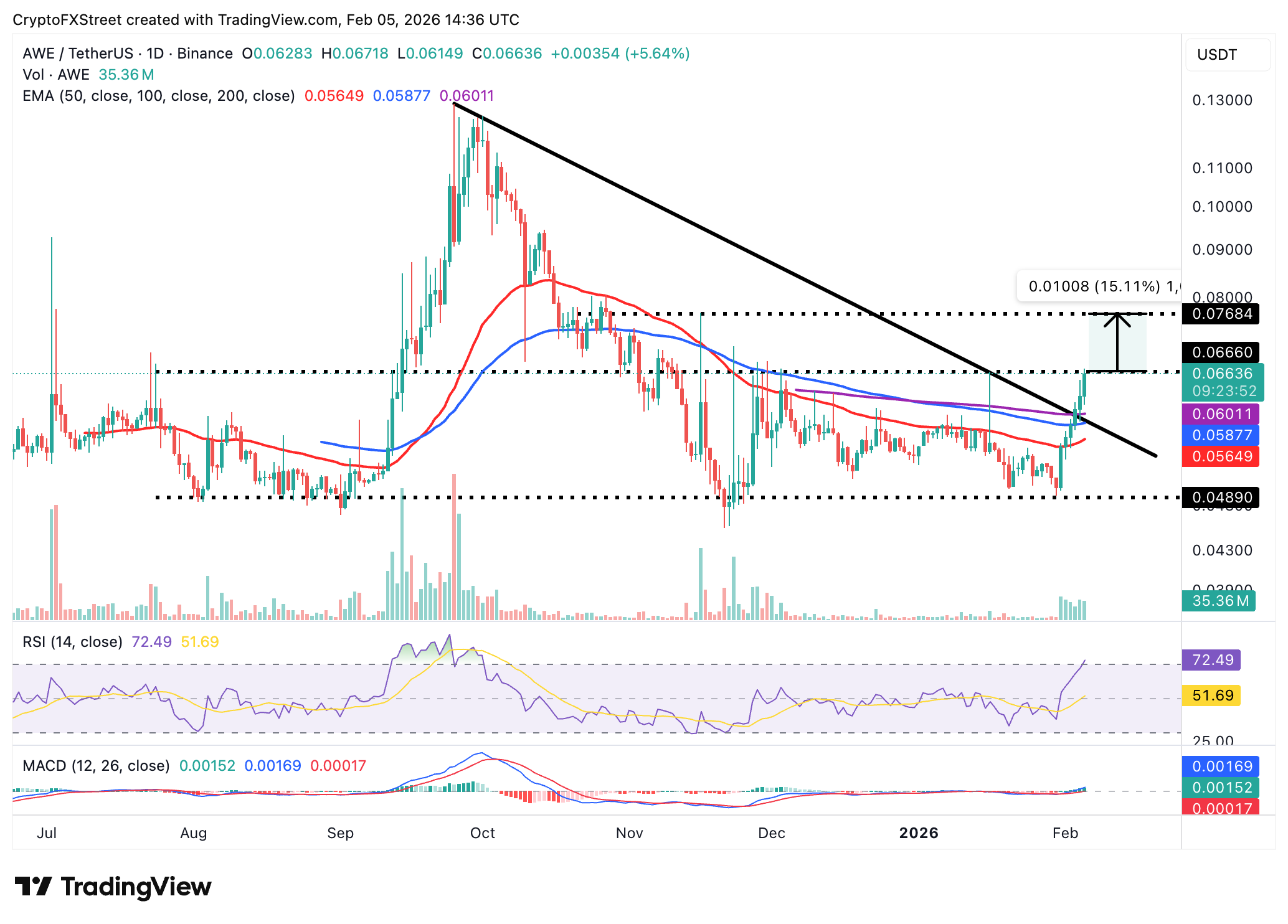 AWE Network is largely in bullish hands, trading above $0.066 while the 200-day Exponential Moving Average (EMA) at $0.060, the 100-day EMA at $0.059 and the 50-day EMA at $0.056 reinforce a short-term bullish outlook.