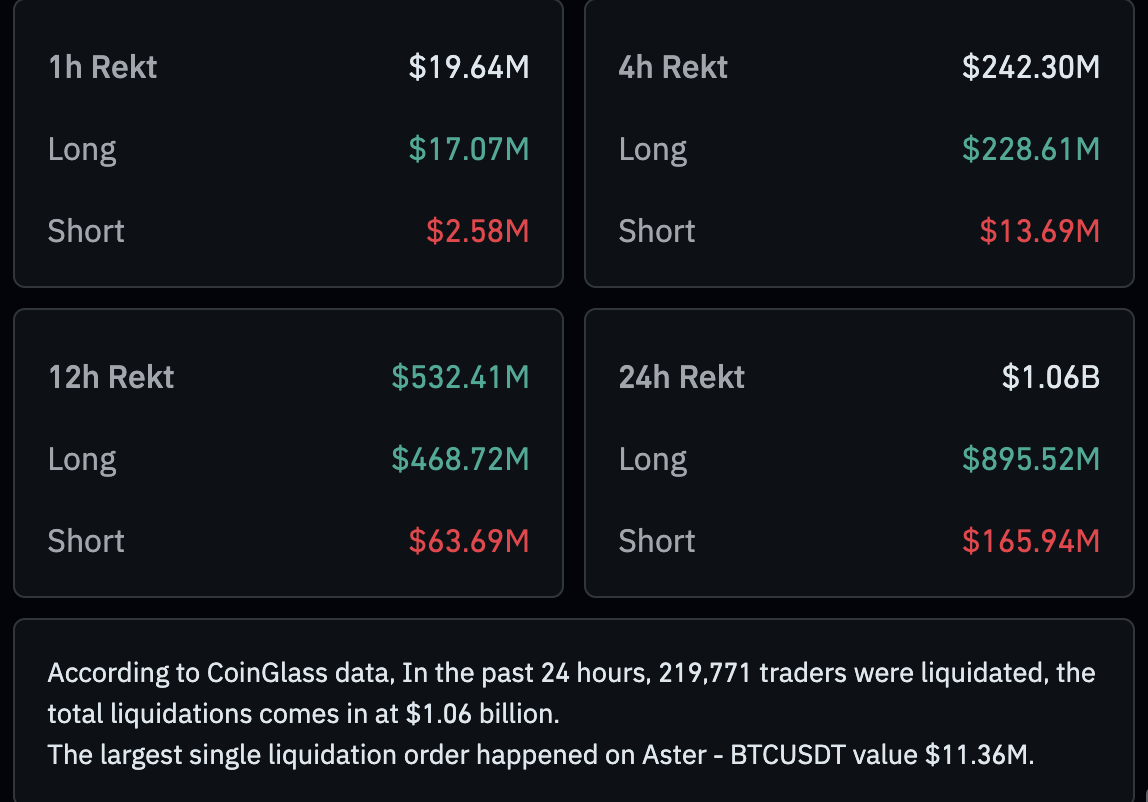 Long position traders bore the biggest brunt of the correction, with approximately $896 million wiped out. Short position holders, on the other hand, lost nearly $166 million in the same period 24-hour period.