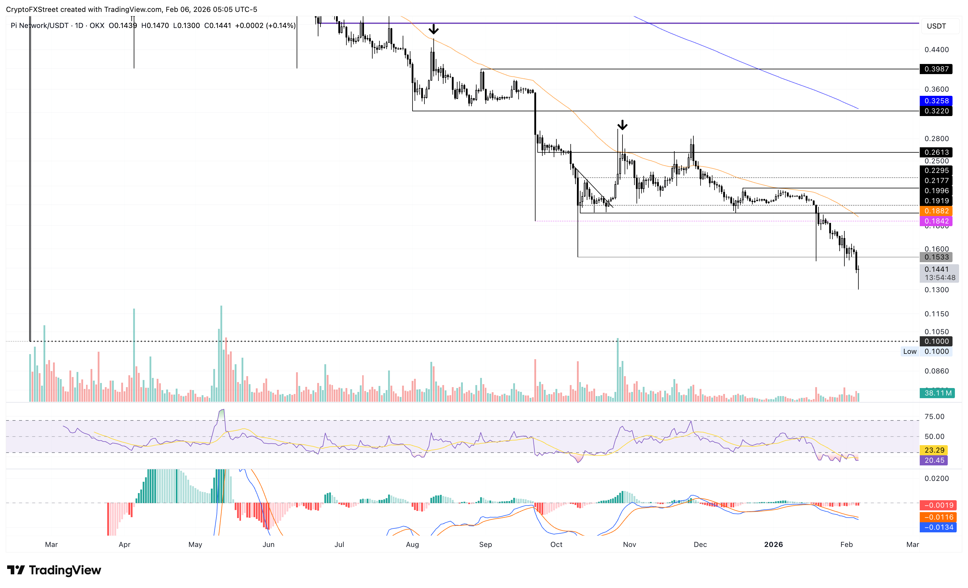 Pi Network (PI) trades above $0.1400 at press time on Friday, recovering from a record low of $0.1300 registered earlier in the day. The PI token's price extends its recent decline amid the broader cryptocurrency market crash and despite the recent announcement of plans to distribute rewards to Know-Your-Customer (KYC) validators.