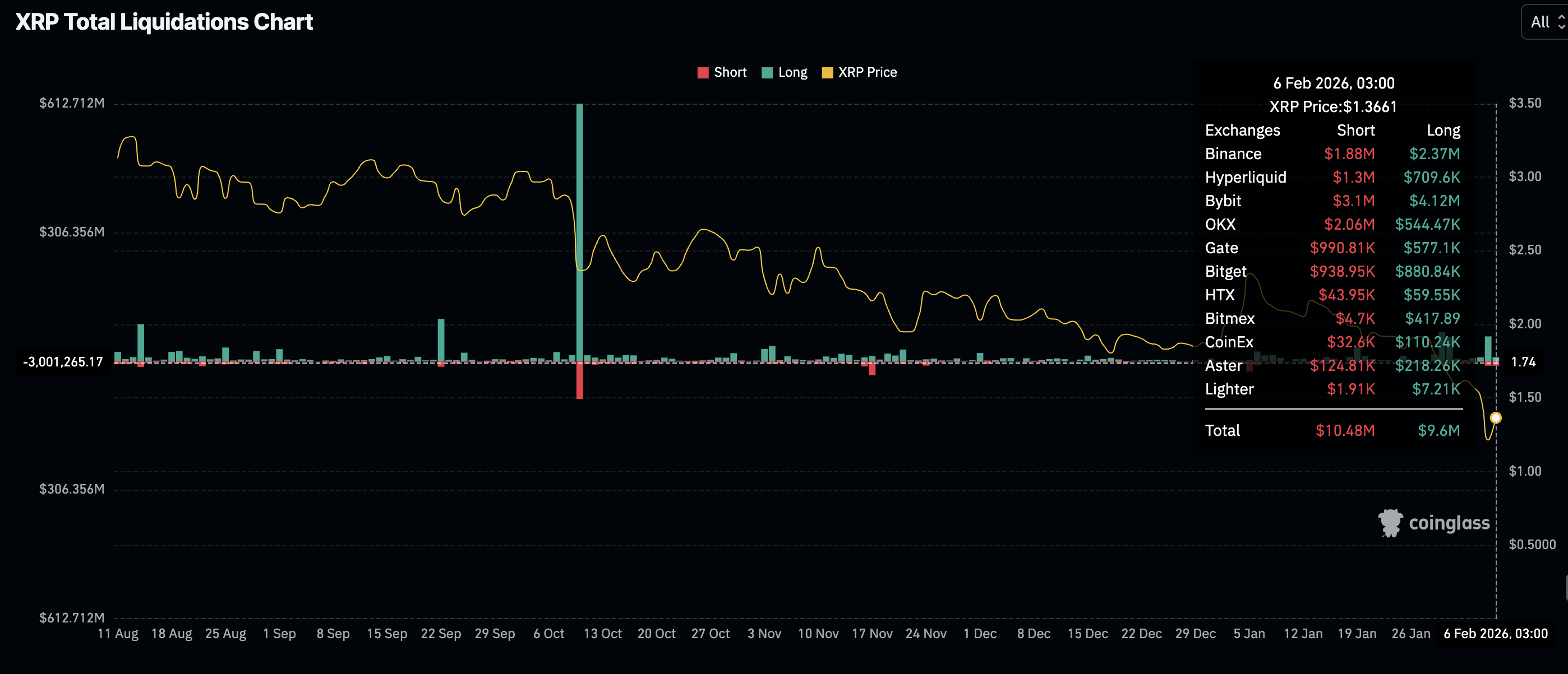 Meanwhile, pressure from liquidated positions has eased, given the ongoing price recovery. According to CoinGlass, approximately $10 million in longs and $10.5 million in shorts have been liquidated on Friday, compared to $59 million in longs and $11 million in shorts on Thursday. As the XRP price rises, pressure on long positions is poised to ease, potentially supporting the recovery.