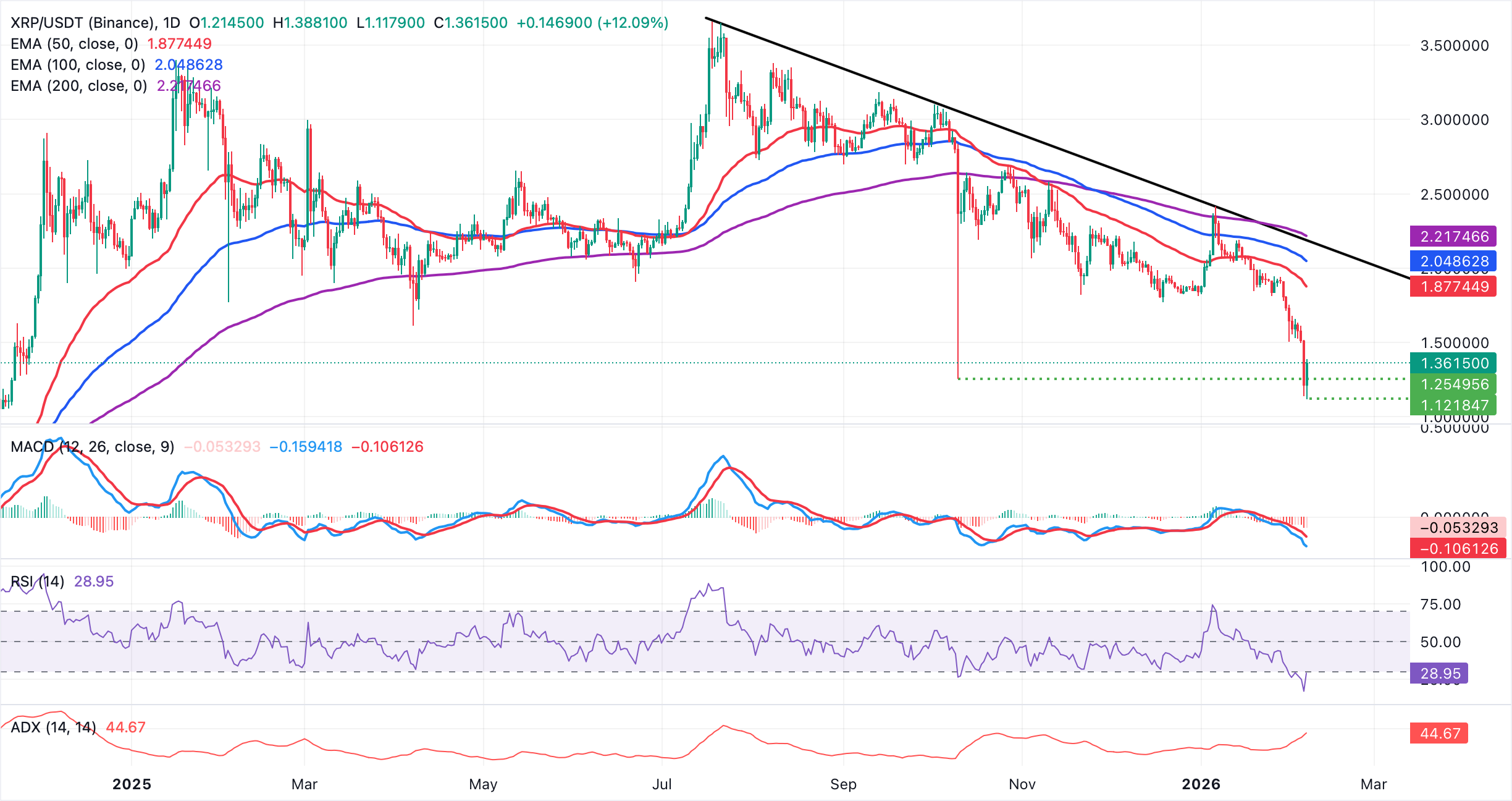 Ripple (XRP) is accelerating its recovery, trading above $1.36 at the time of writing on Friday, as investors adjust their positions following a turbulent week in the broader crypto market. The remittance token is up over 21% from its intraday low of $1.12.