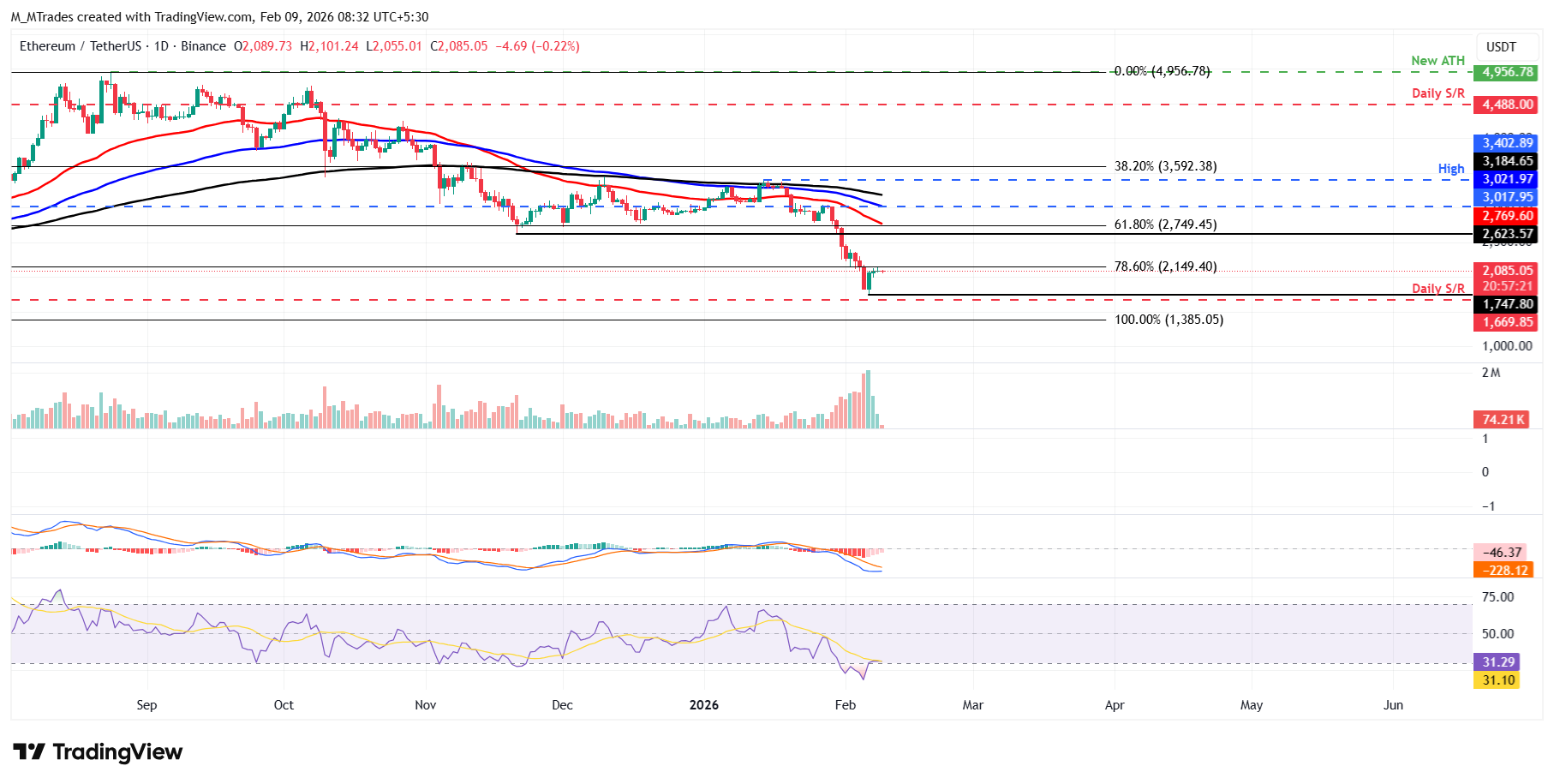 • Ethereum faces rejection around the 78.6% Fibonacci retracement level at $2,149, keeping the short-term upside recovery capped.
