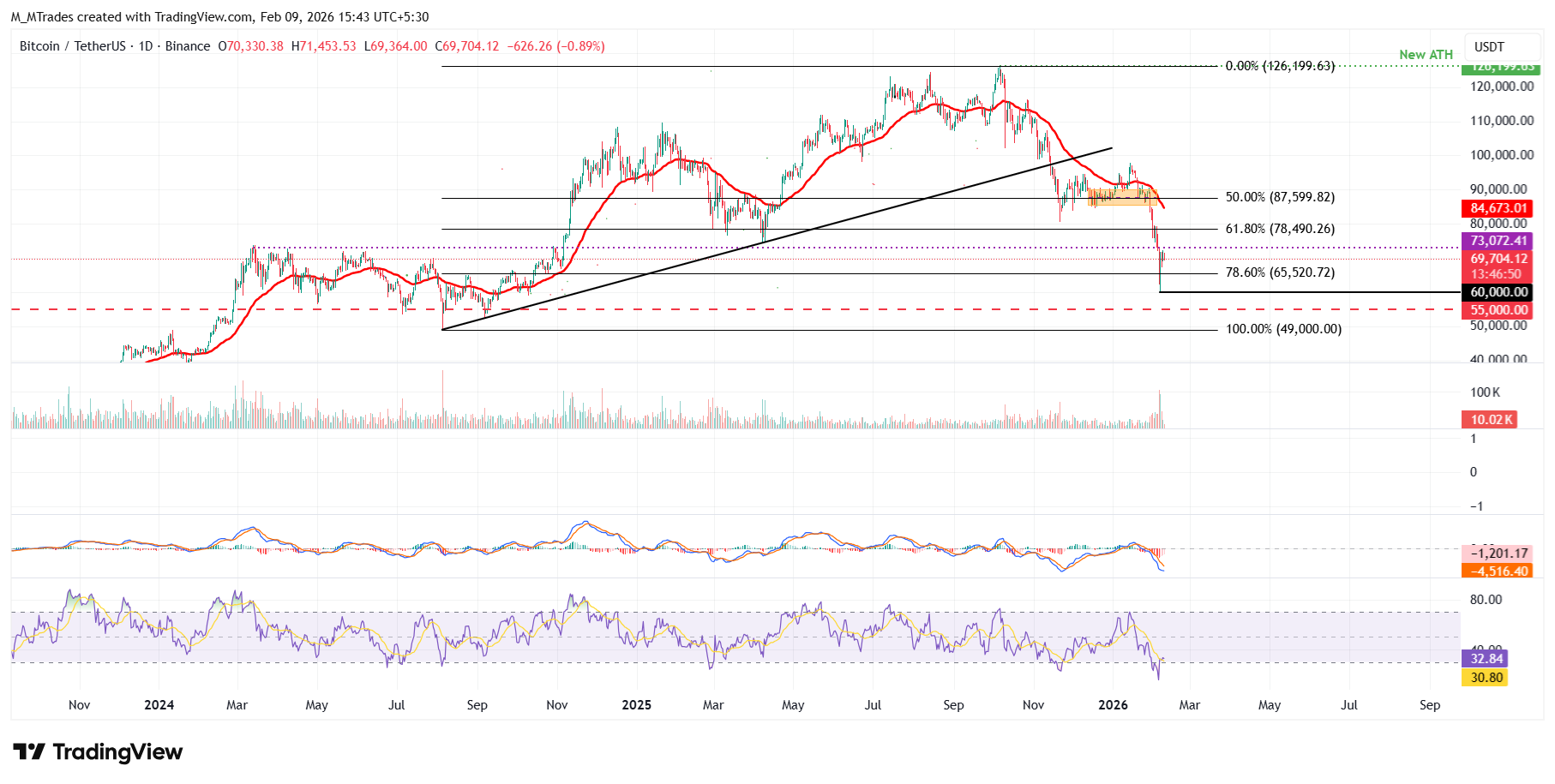 If BTC continues its downward trend, it could extend the decline toward the 78.6% Fibonacci retracement (drawn from the August 2024 low of $49,000 to the October 2025 all-time high of $126,199) at $65,520.