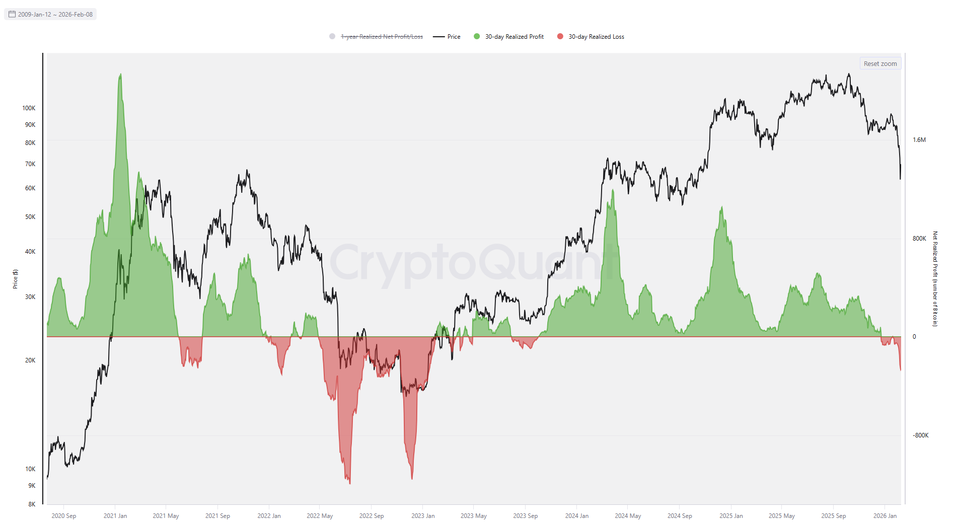 The CryptoQuant data chart below shows that holders have been realizing net losses that continue to intensify, weighing on the BTC price. The metric turned negative on January 20 and has been falling continually, reaching losses of 263,000 BTC on Sunday. In addition, the current pattern closely mirrors the 2021–2022 bull-to-bear transition, when realized profits peaked in January 2021, formed lower highs through 2021, and then flipped into net losses ahead of the 2022 bear market.