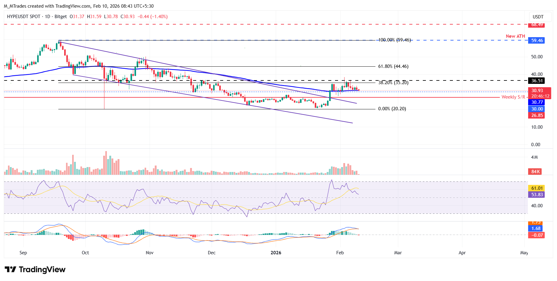 However, if HYPE breaks and closes above the upper consolidation range at $36.51 on a daily basis, it could extend the rally toward the 61.8% Fibonacci retracement level at $44.46.