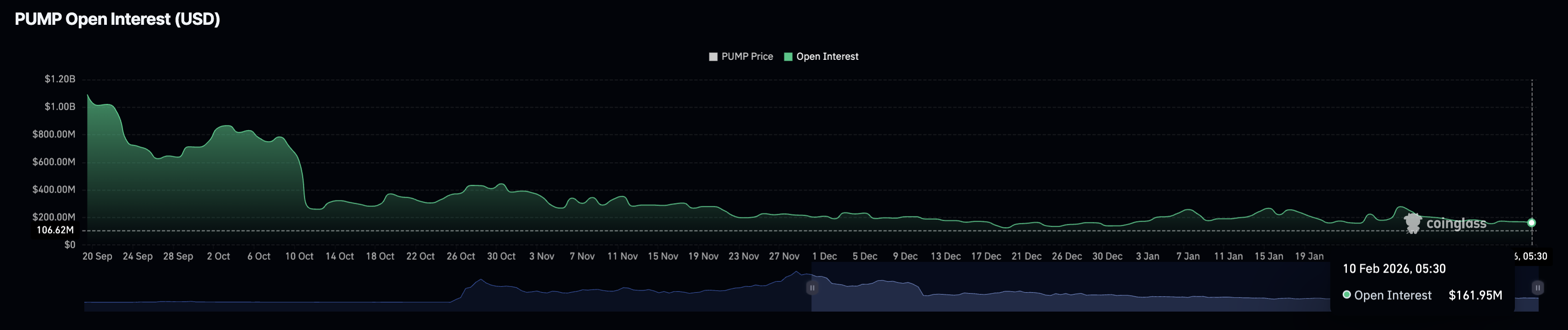 CoinGlass data shows a steady decline in PUMP futures Open Interest (OI), which fell to $161.95 million on Tuesday, underscoring reduced retail interest.