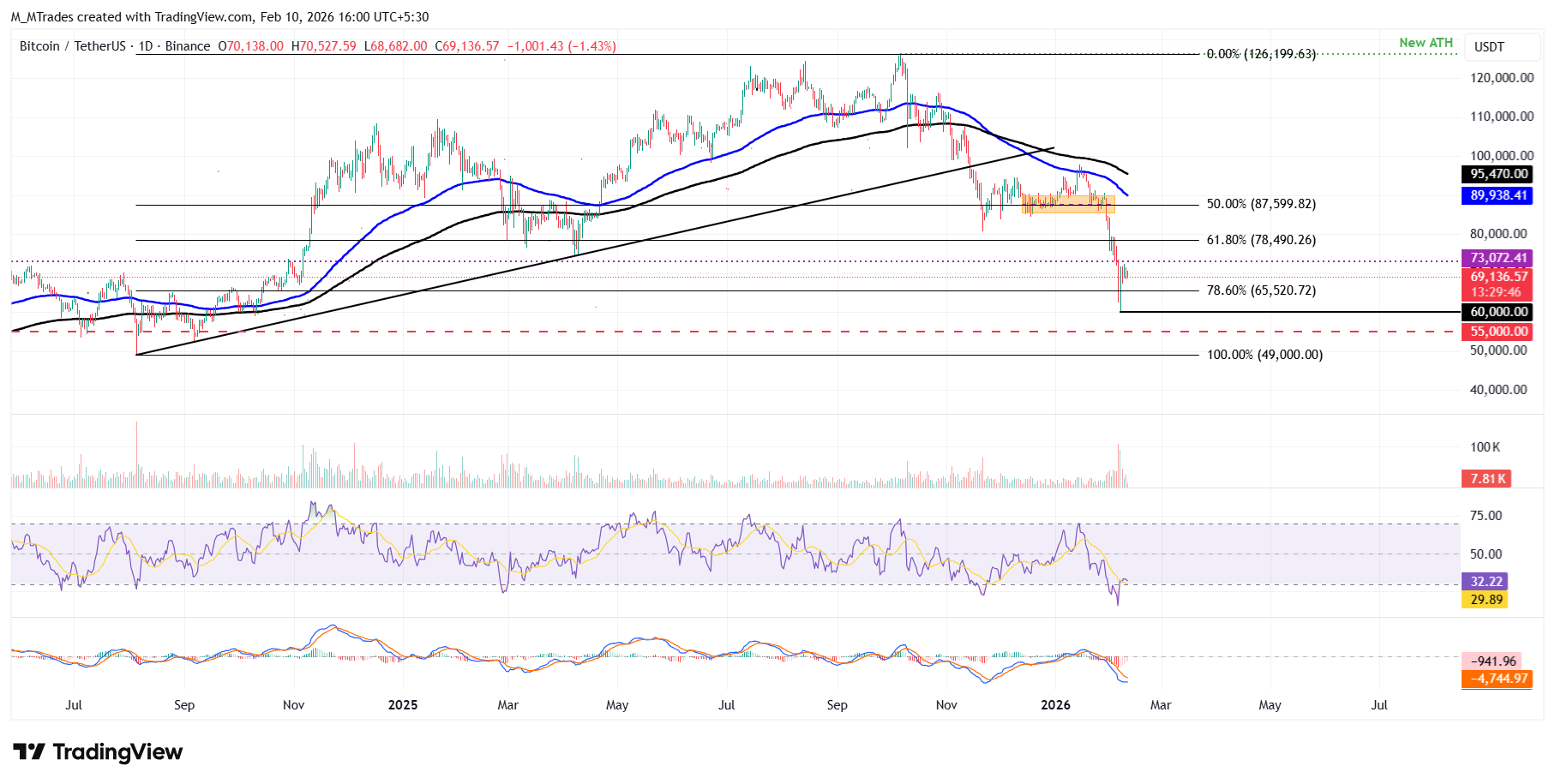 If BTC continues its downward trend, it could extend the decline toward the 78.6% Fibonacci retracement (drawn from the August 2024 low of $49,000 to the October 2025 all-time high of $126,199) at $65,520.