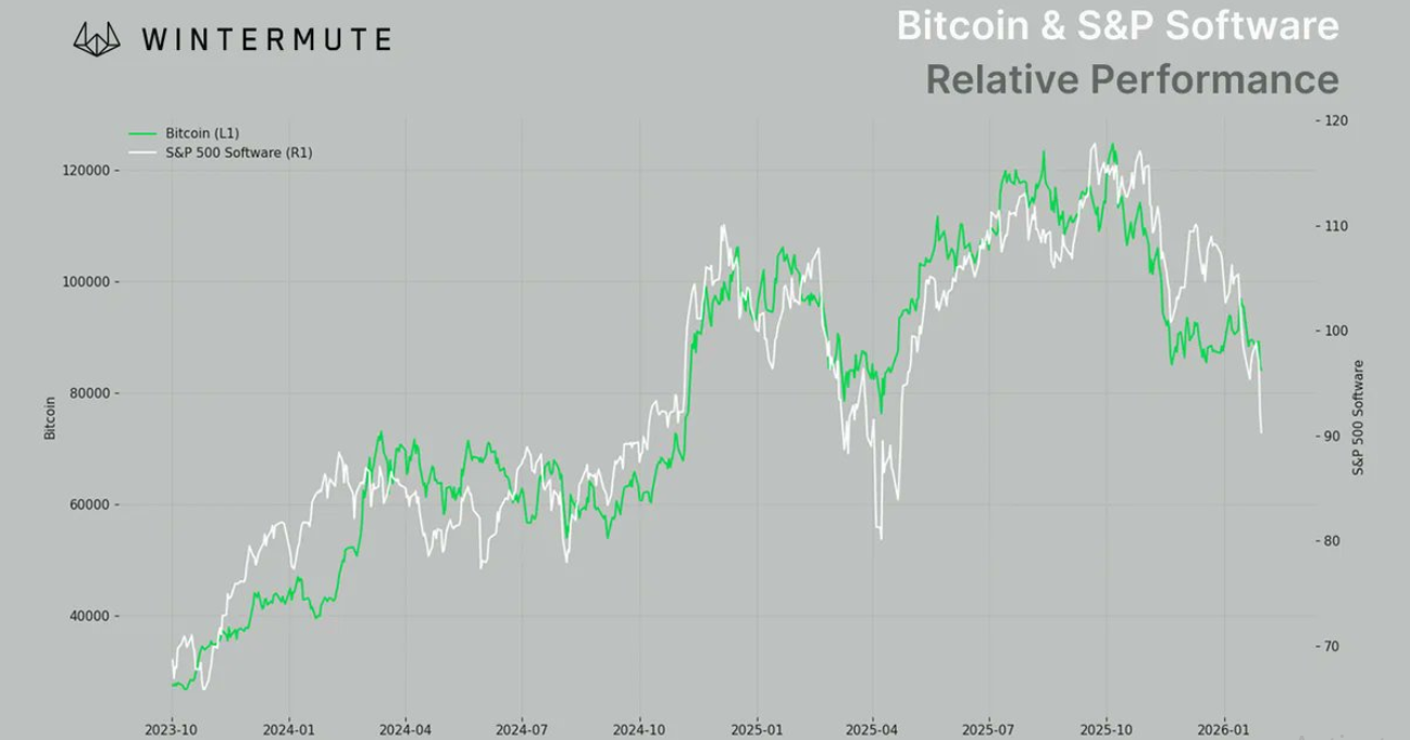 A further analysis by the firm showed that the resilience of stock indices during market uptrends and declines is largely attributed to rotation into the AI narrative rather than broader strength in the entire stock market. Wintermute noted that Bitcoin and S&P 500 software companies have largely traded in a similar pattern over the past two years.