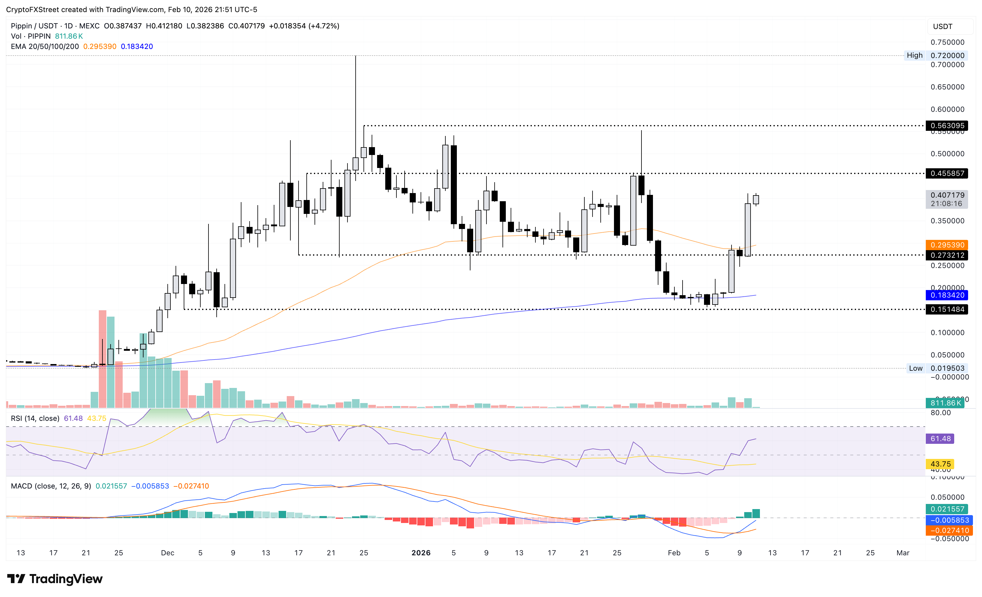 PIPPIN is up roughly 40% so far this week, extending its 55% gains from the previous week. At the time of writing, PIPPIN is up nearly 5% on Wednesday, building gains on its 43% rally from the previous day.
